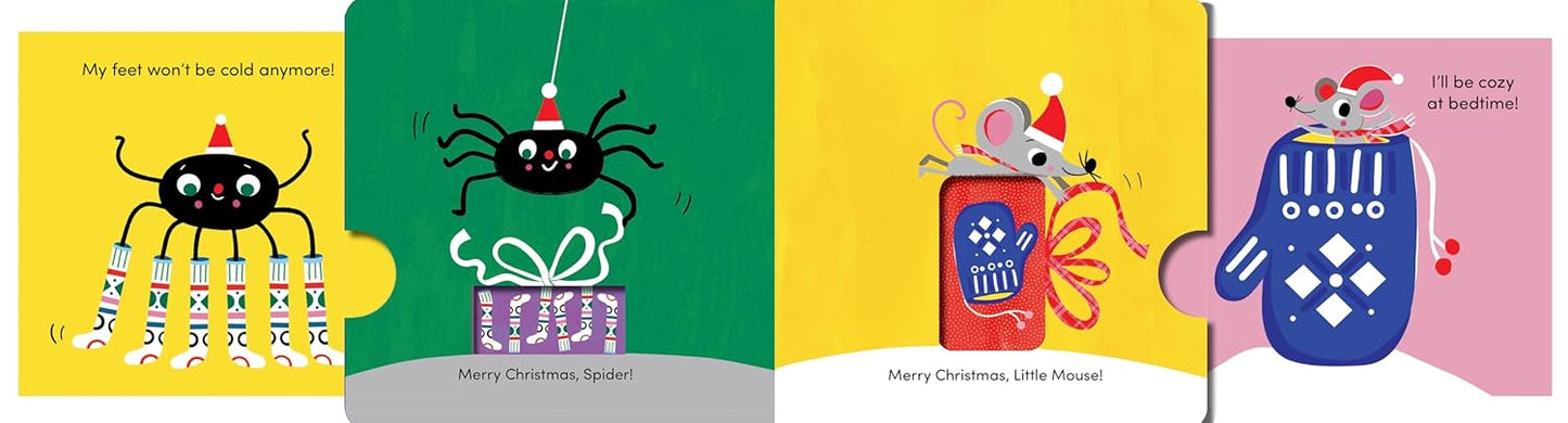 With every pull of the tabs, little hands will reveal the delightful gifts Santa Claus has for each animal – cozy socks for the spider, snug pajamas for the crocodile, a speedy sled for the penguin, and a charming hat for the ladybug!