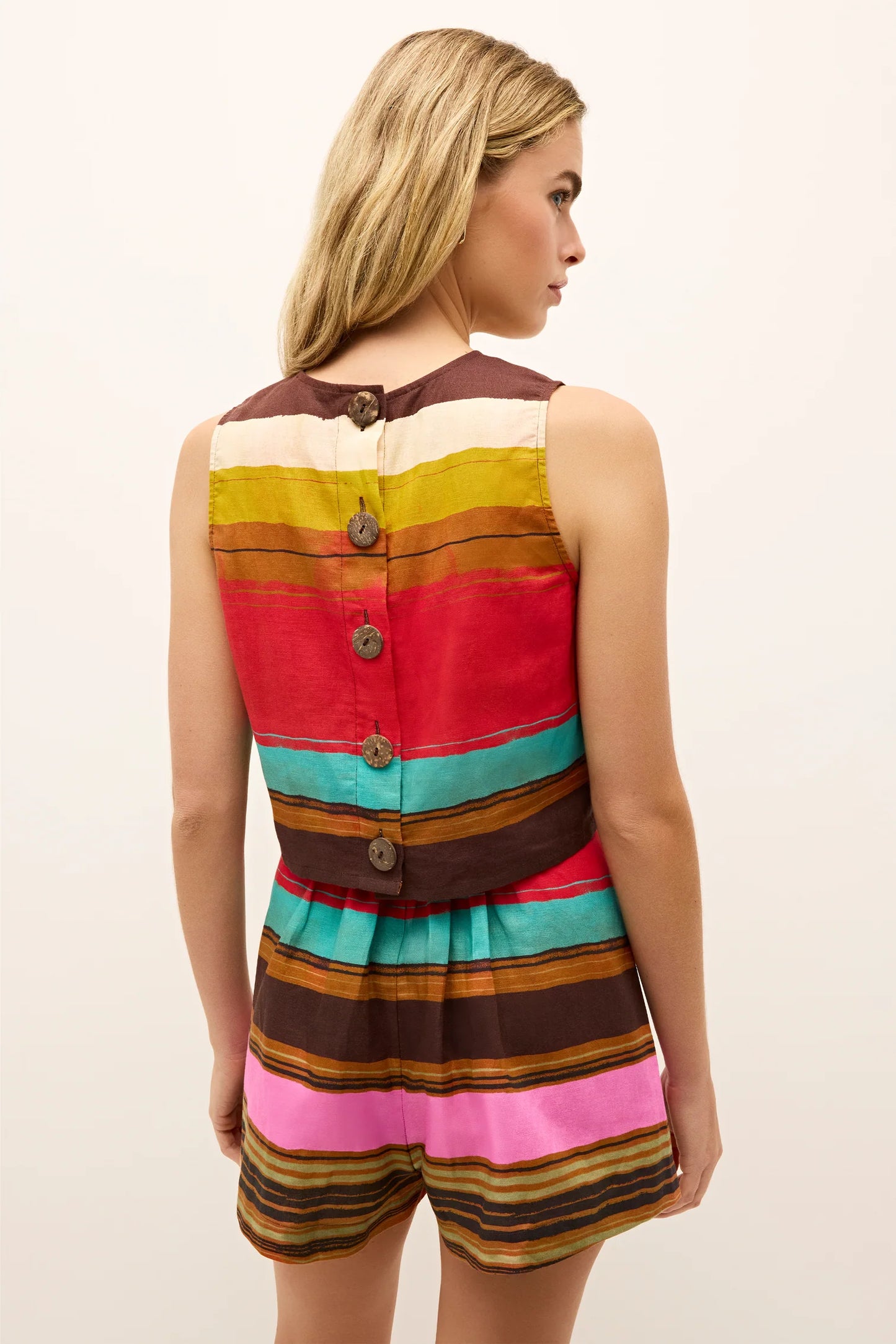 Regular price $73.75An update to our beloved Blanche silhouette, this breezy short is crafted from a new linen-cotton blend and features a fixed elastic waistband for a comfortable, flattering fit. Shown in Grotto—a painterly stripe in sun-washed hues of red, mustard, turquoise, and cream—it pairs with the matching Fallon top for a summer set made for Mediterranean daydreams.