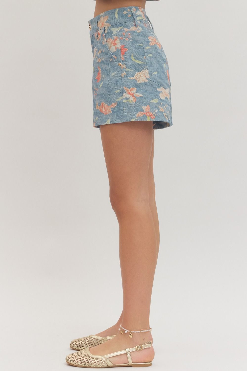 Botanical print high-waisted shorts featuring gold-tone button and zip-fly front closure. Side pockets. Back pockets. Unlined. Woven. Non-sheer. Lightweight.