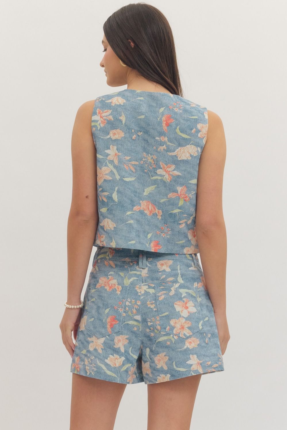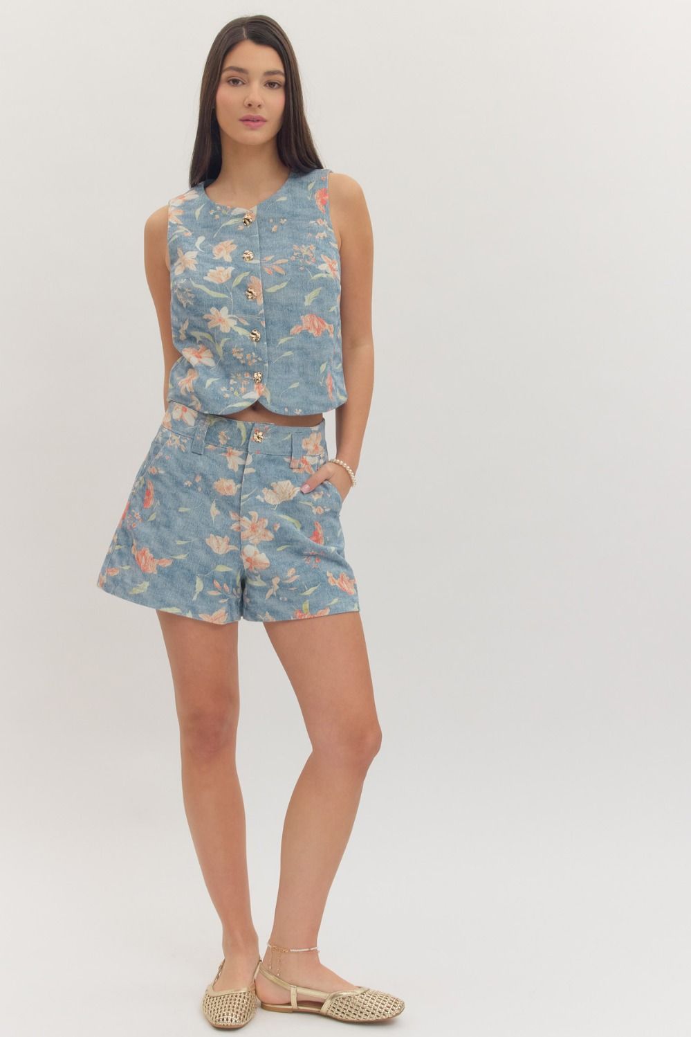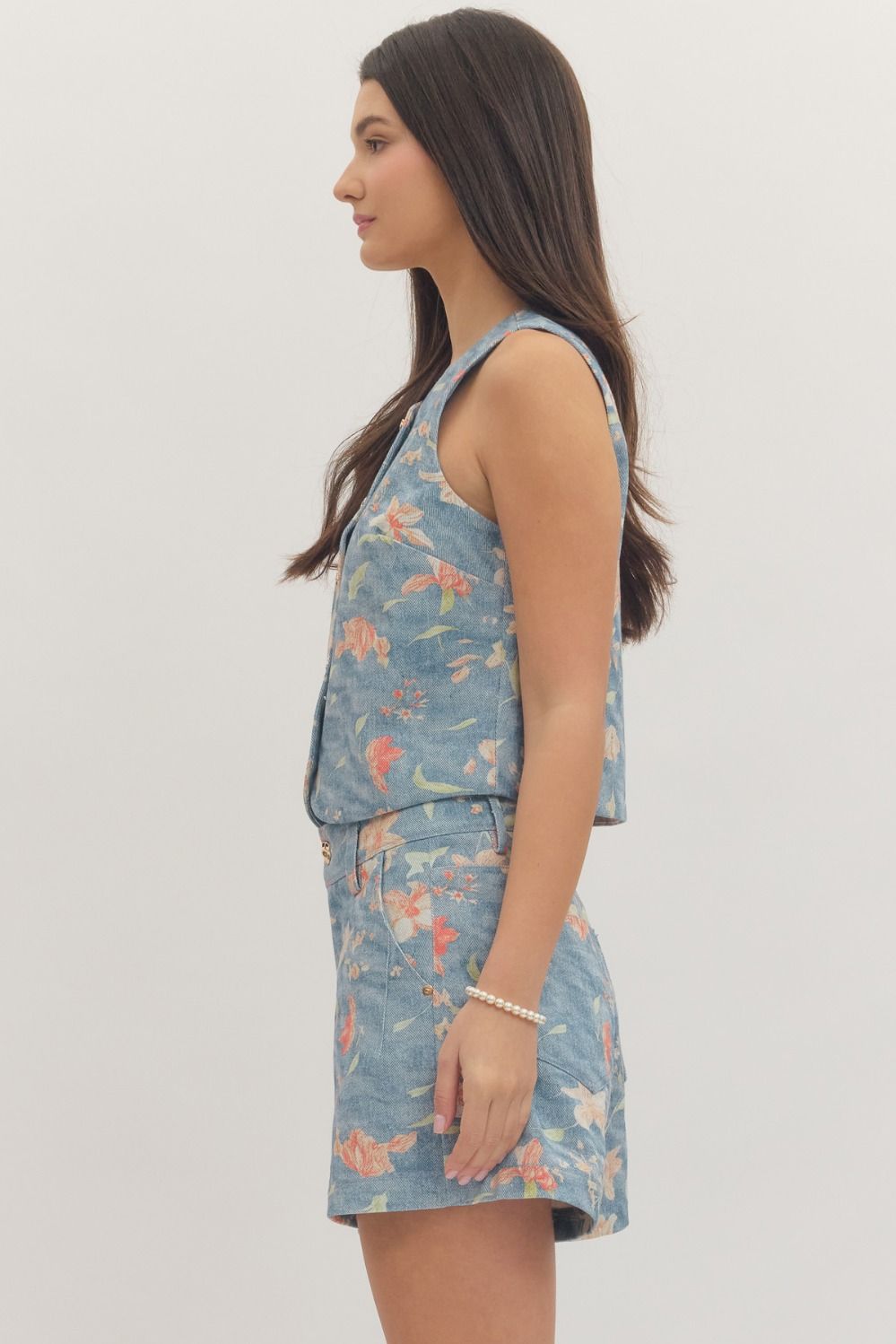 Botanical print sleeveless cropped jacket featuring gold-tone button closure at front. Lined. Woven. Non-sheer. Lightweight.