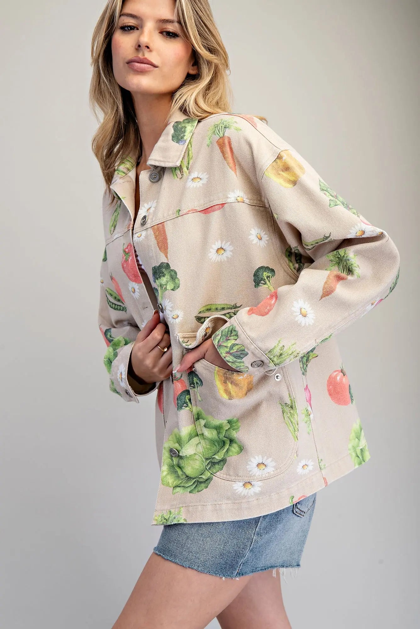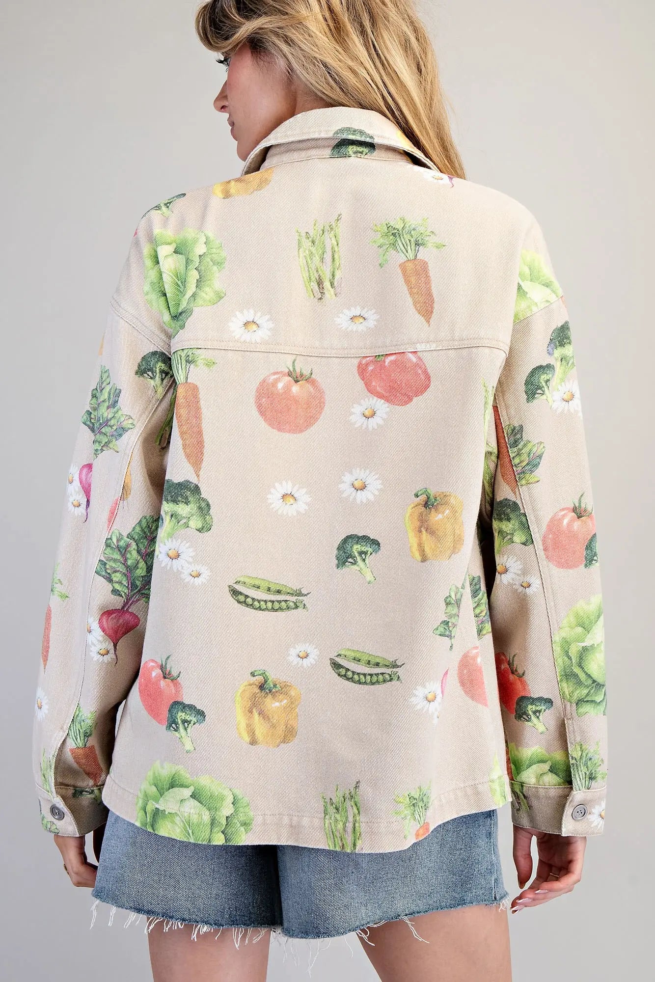 This playful mineral washed jacket features a classic collar, button front closure, flap patch pockets, and buttoned cuffs, all brought to life with an allover vegetable and daisy print for a fun, whimsical finish.