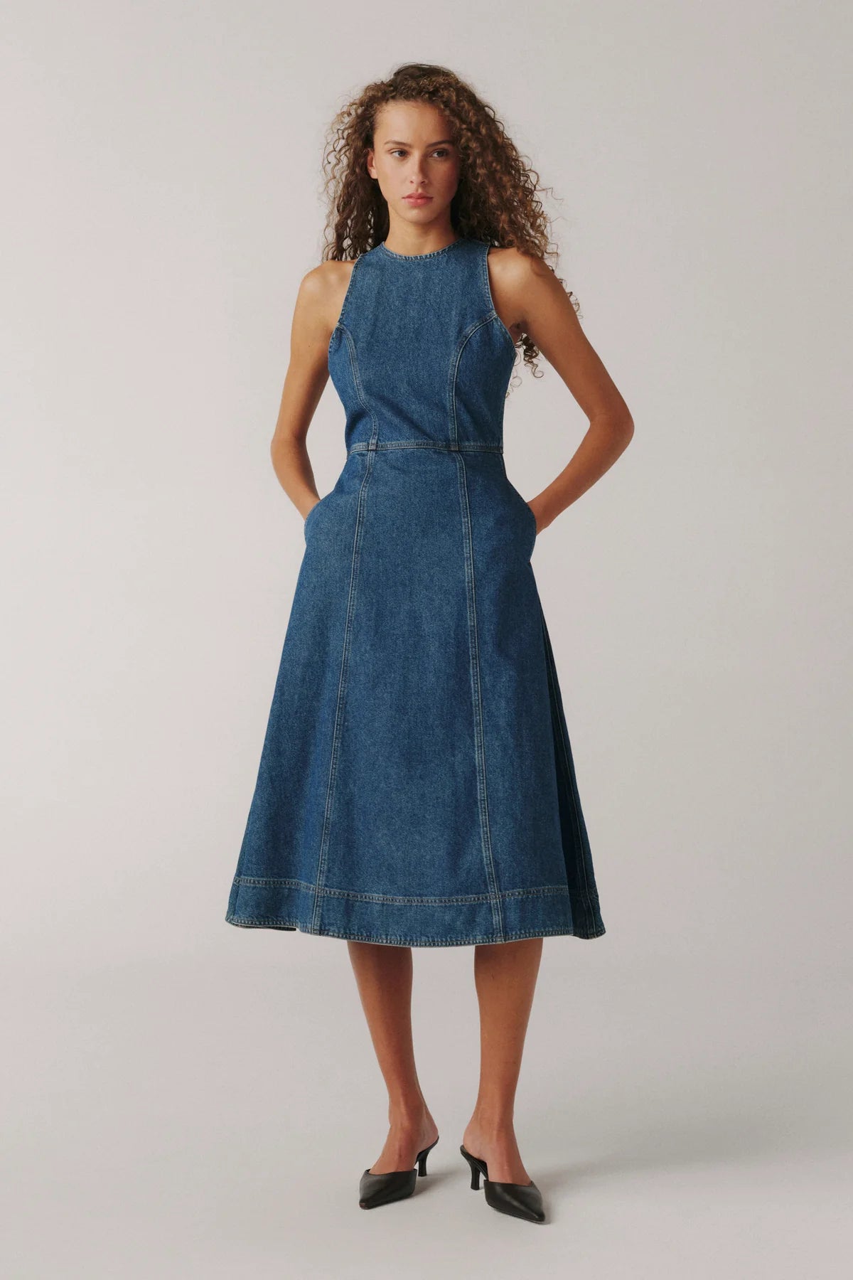 Proper is a mid-wash denim with a keyhole and zip closure, a clean hem and pockets for a structured yet wearable silhouette.