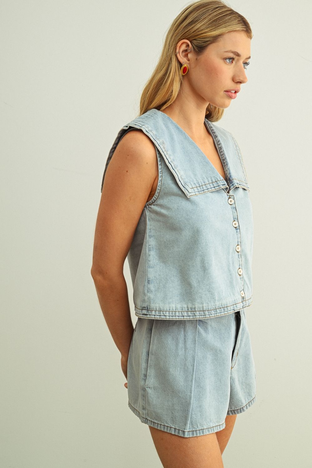 SAILOR COLLAR BUTTON FRONT DENIM TOP