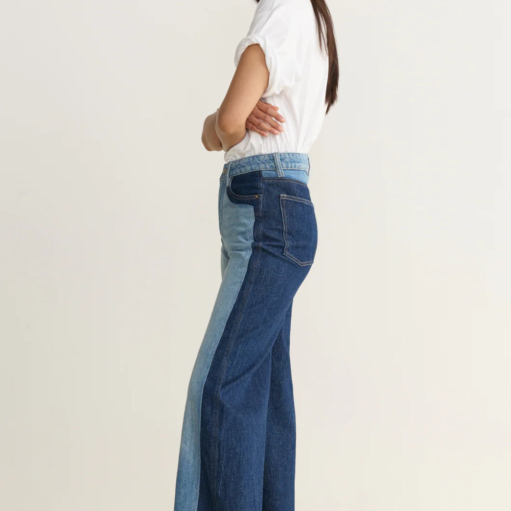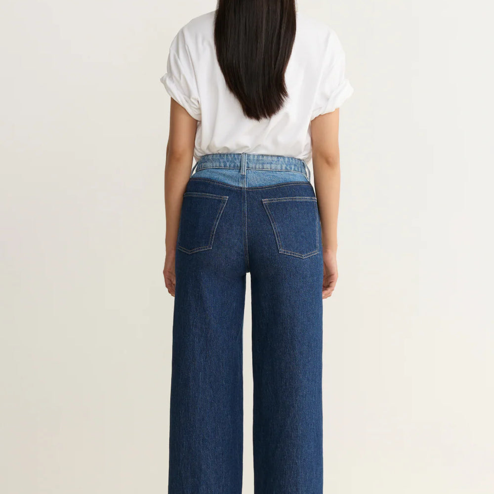 These wide-leg jeans blend a relaxed, high-rise silhouette. Featuring a unique light wash front contrasted by a dark denim back panel, pocketing, and waistband. Classic stitching and silver hardware complete the clean, polished look, making these jeans versatile for both casual and refined outfits.