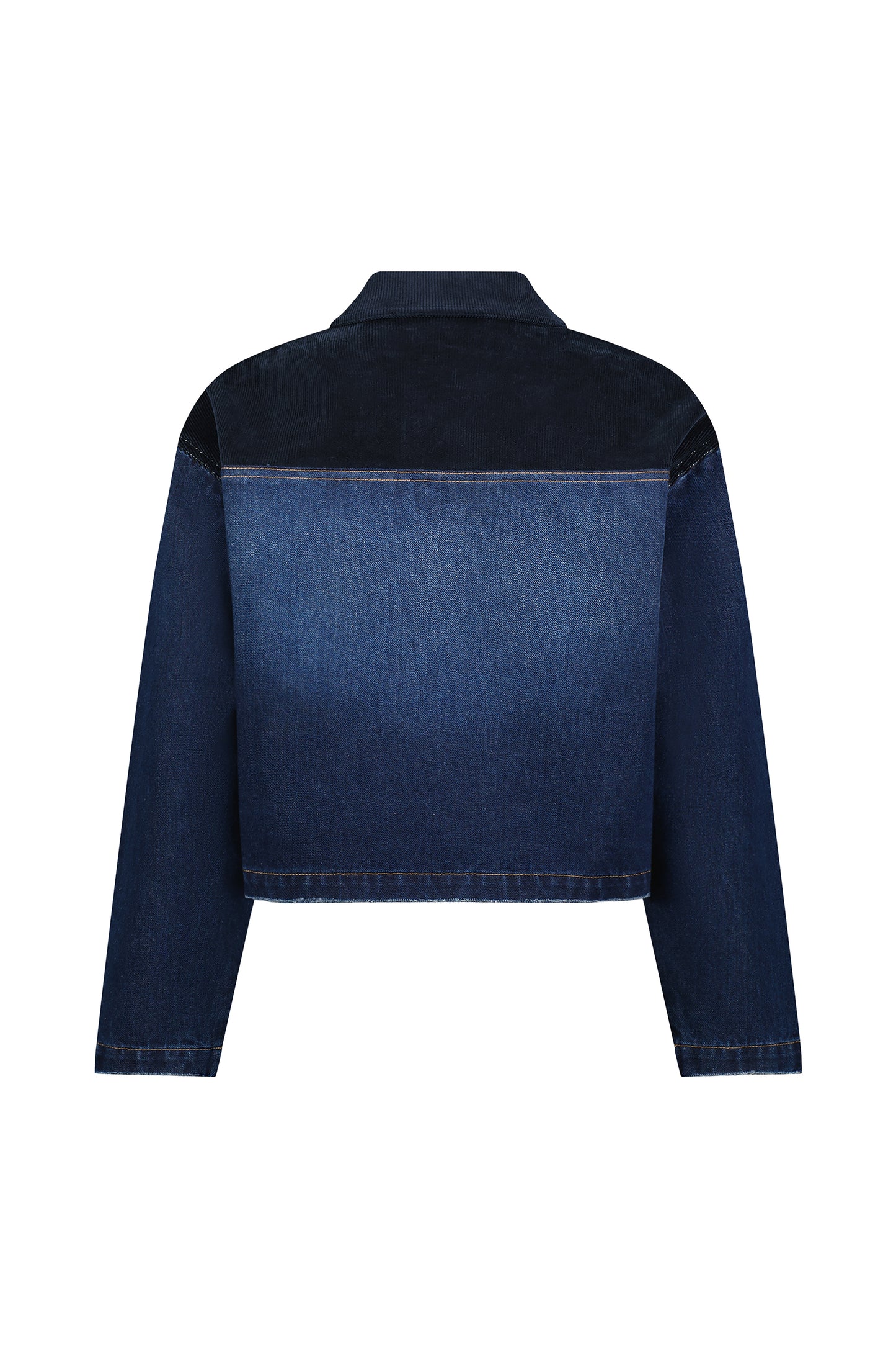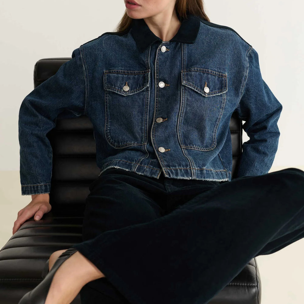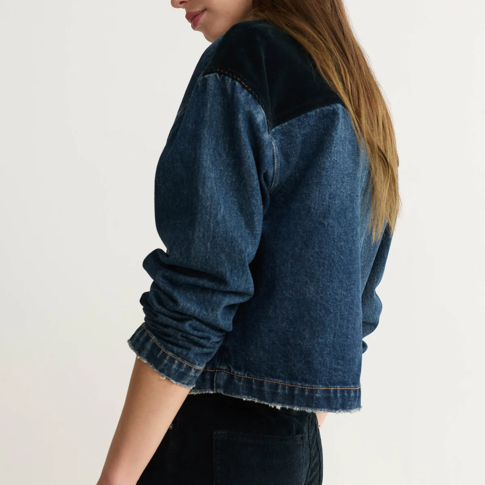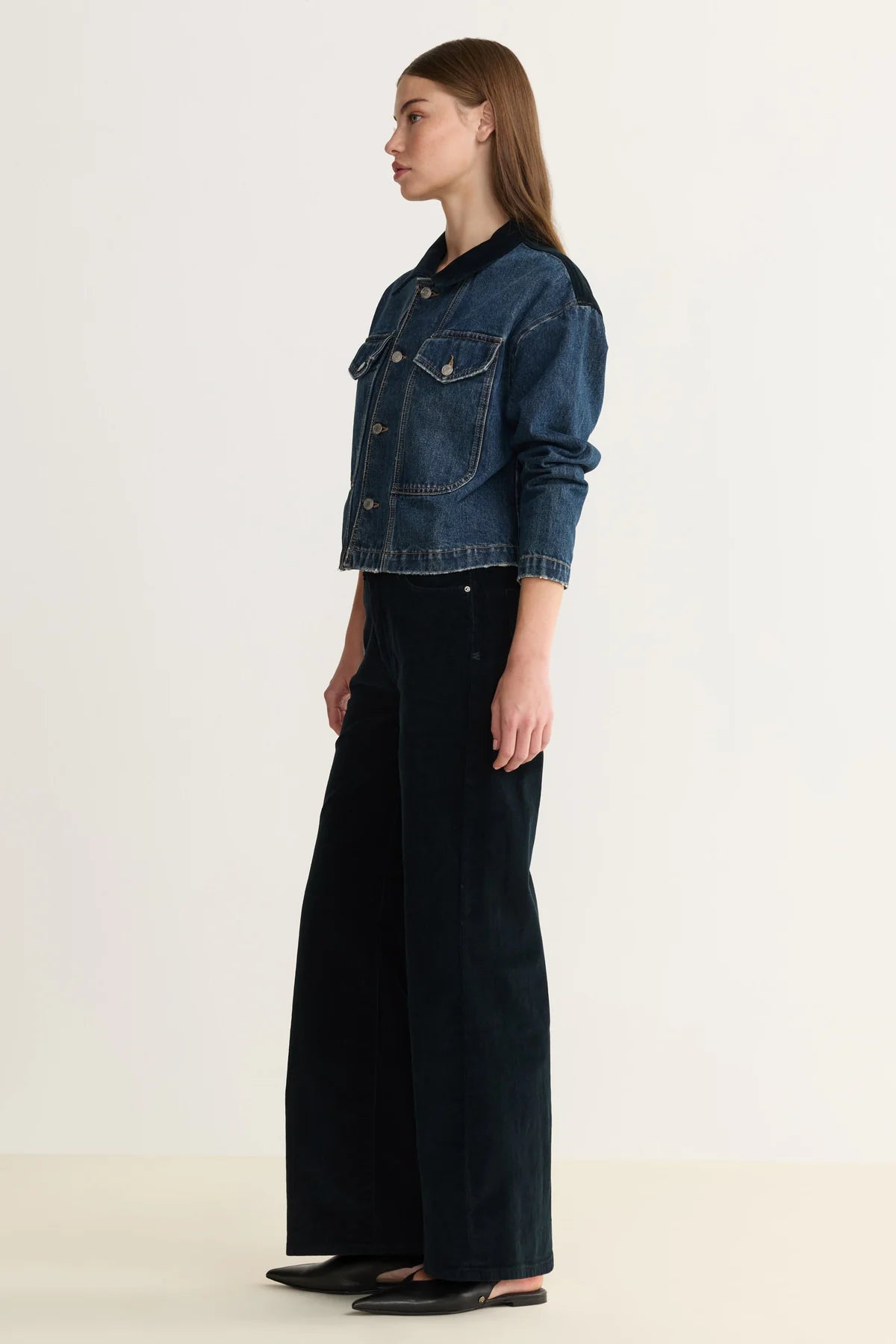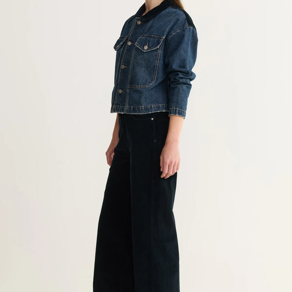 Mercer is a dark indigo wash with a navy corduroy collar. It features silver hardware and utility pocket detailing.