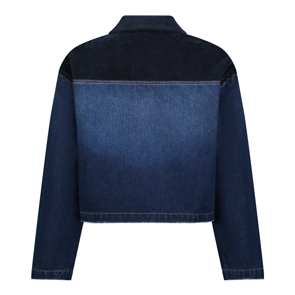 AVL is a long sleeved, cropped denim jacket with a relaxed fit and center front button opening.