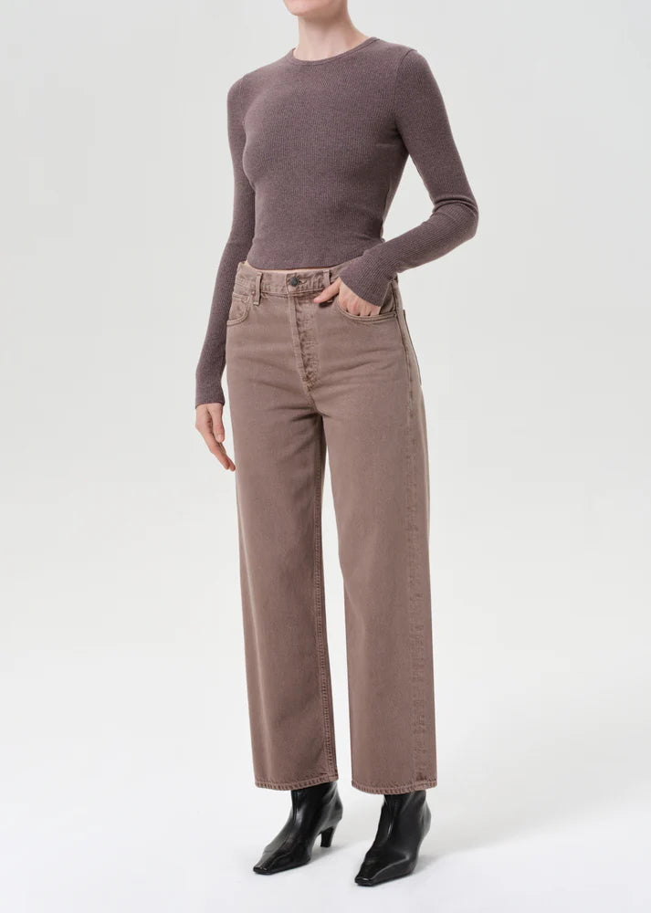 AGOLDE’s Ren Jean offers an elevated take on the classic wide-leg silhouette. Made from 100% rigid, non-stretch regenerative cotton, these high-rise jeans feature a rich dusty rose tone with subtle marbling. The cropped wide legs create a relaxed yet flattering fit, while the heavyweight denim ensures all-day comfort. Pair with neutral tones or a crisp white top for a polished look.