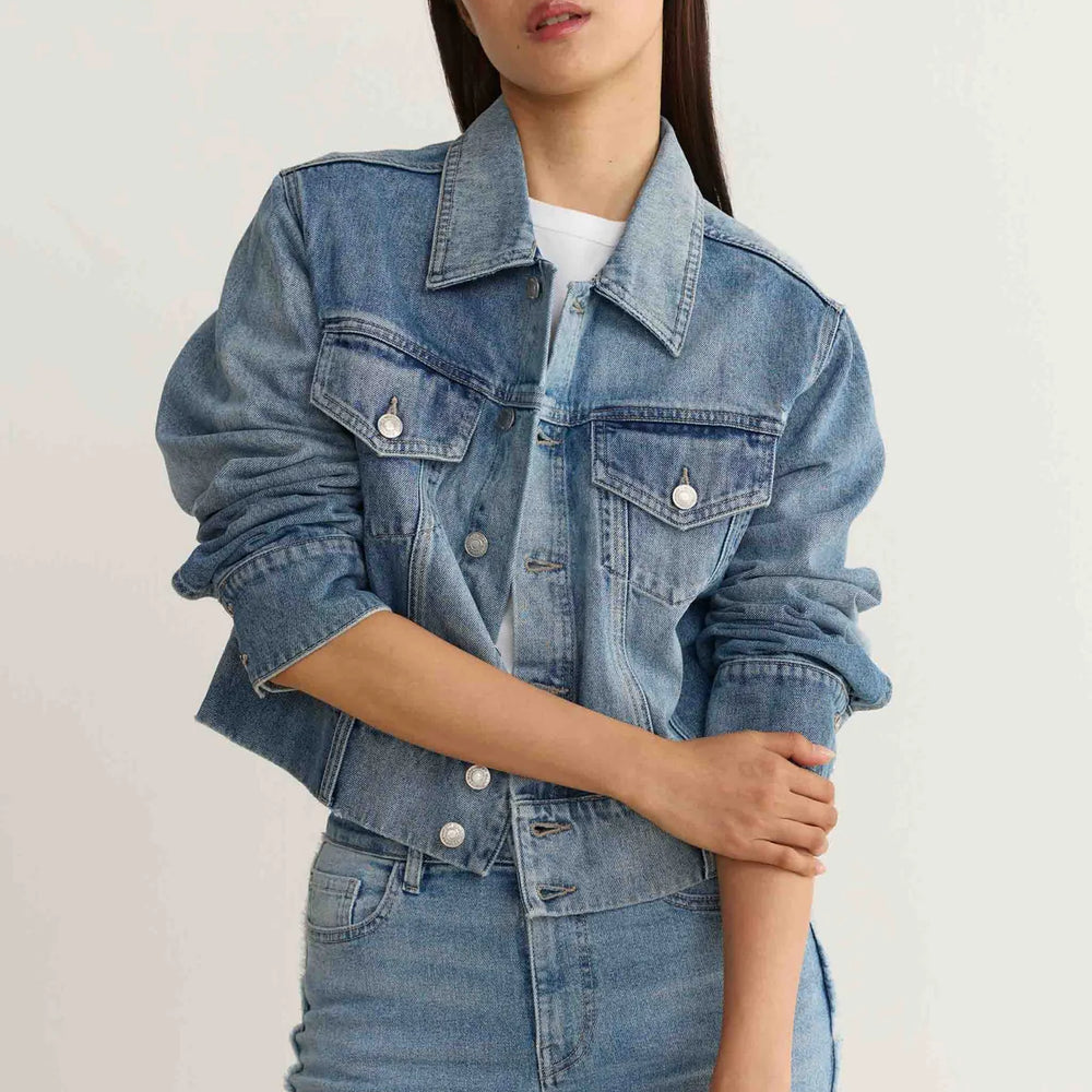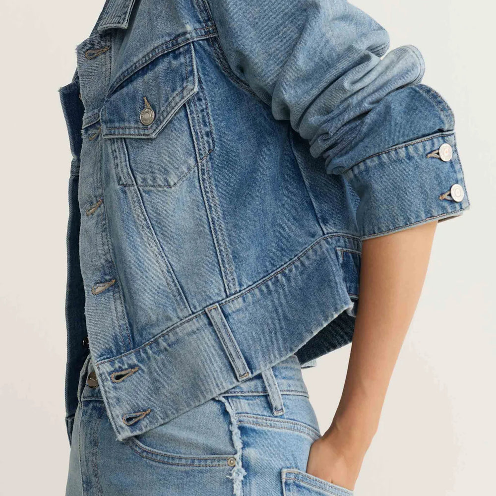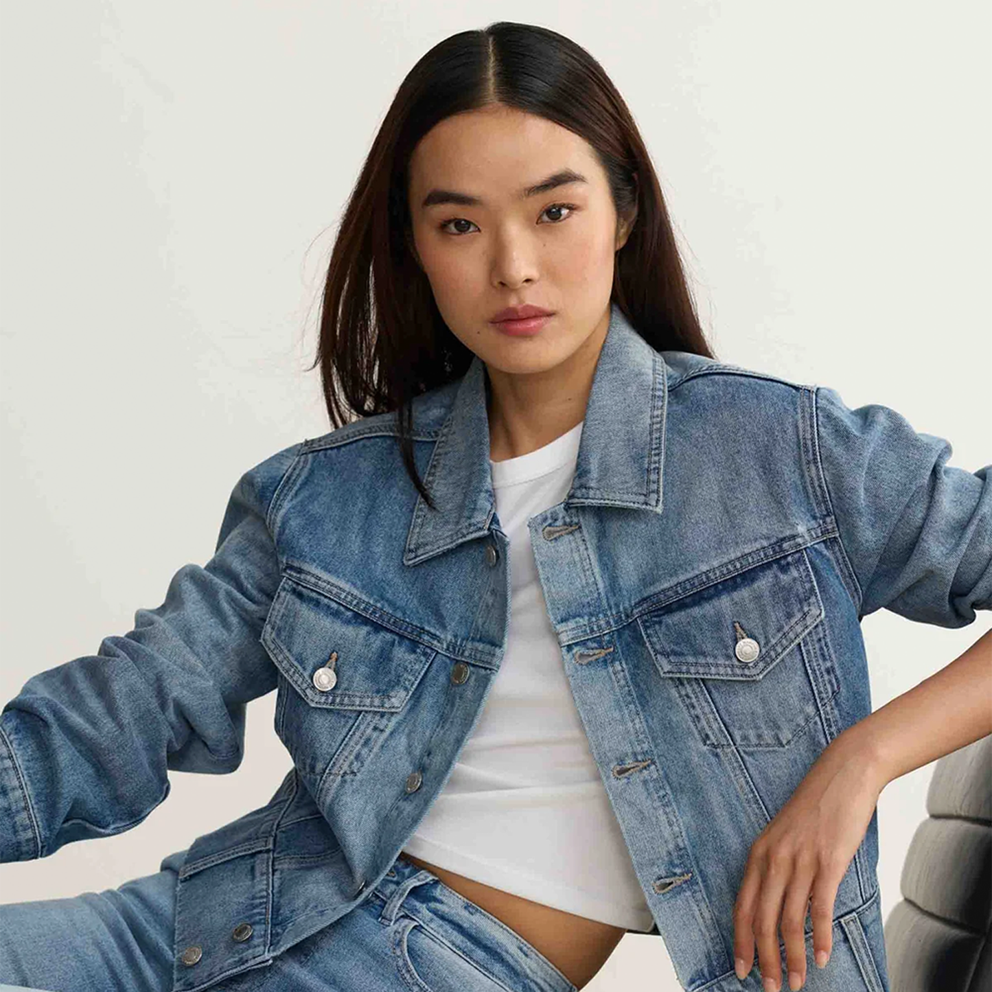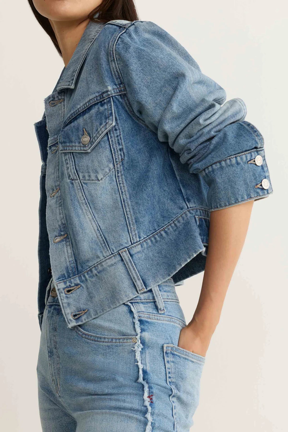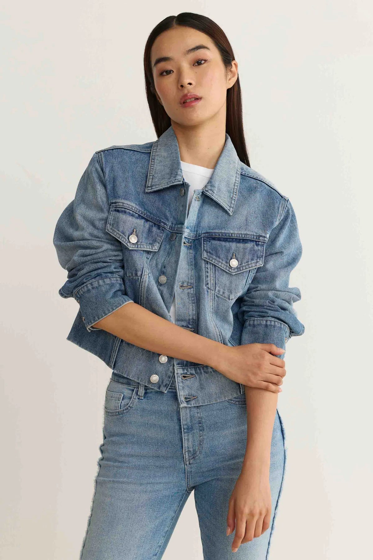 KPB is a classic trucker-inspired denim jacket with long sleeves and a cropped length.