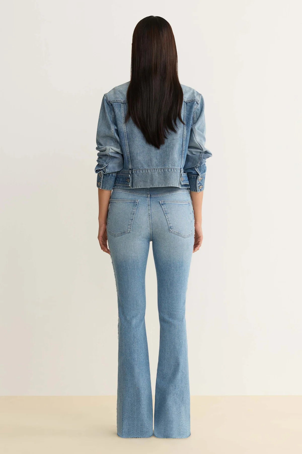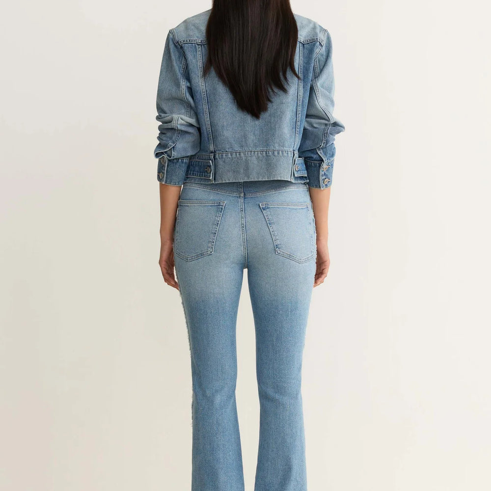 Bambino is a vintage-inspired light wash with grinding at the hem and silver hardware.