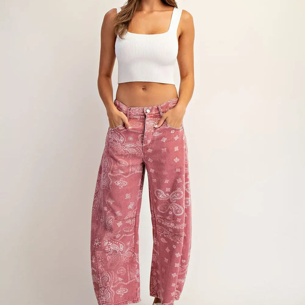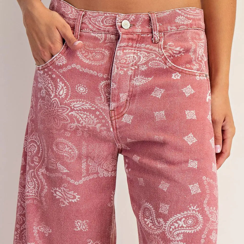 Product Detail: These enzyme, stone and mineral washed barrel jeans feature an allover bandana inspired print, front and back pockets, and visible seam paneling through the legs, finished with belt loops and a button closure for a bold, softly structured barrel leg silhouette with laidback edge.