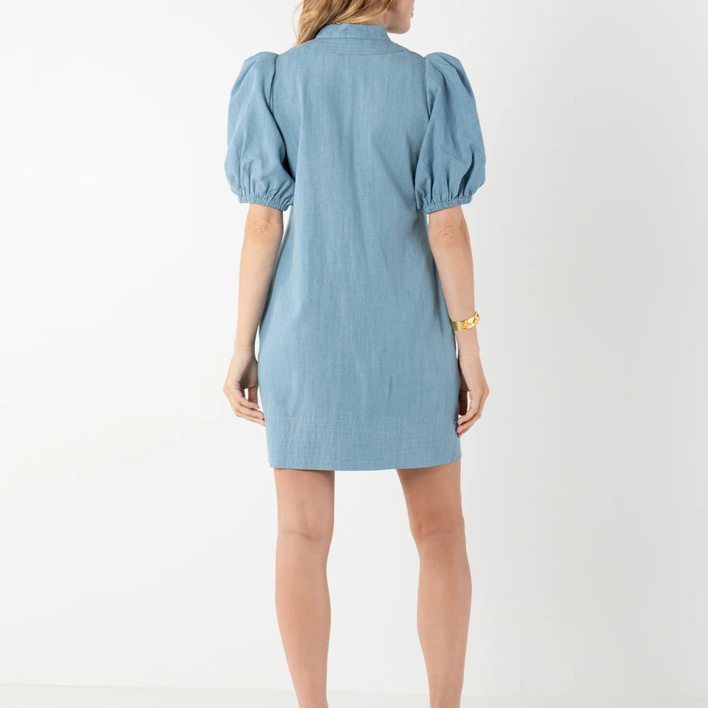 Lightweight and laid-back, the Hampton Mini in Denim Chambray is an easy favorite for transitional dressing. Crafted in a soft, breathable chambray fabric, this relaxed silhouette features a mandarin-style collar, puff sleeves, and subtle tailoring that adds shape without clinging. Finished with functional side pockets, it’s a versatile piece that moves seamlessly from casual afternoons to more polished plans with a simple change of accessories.