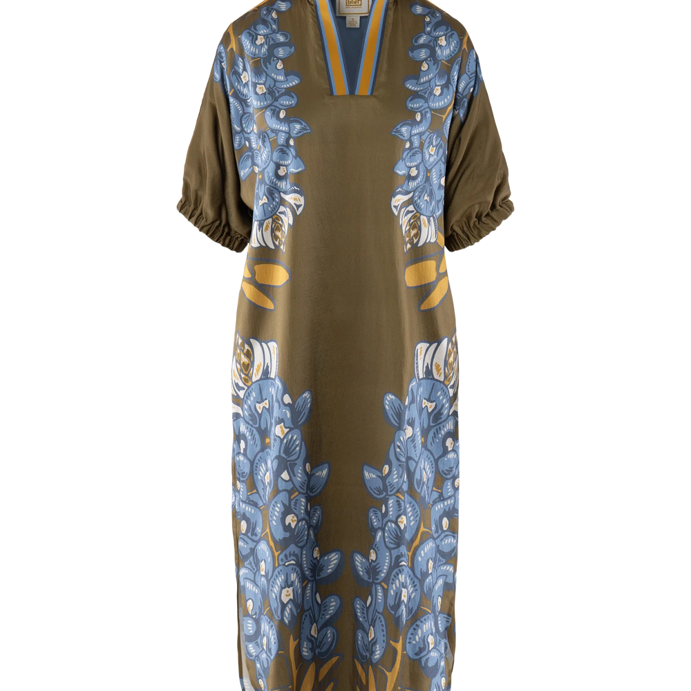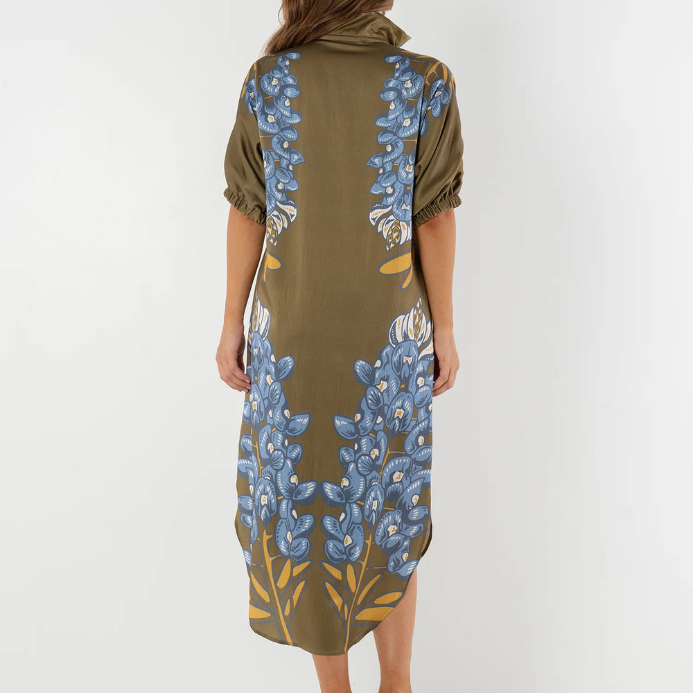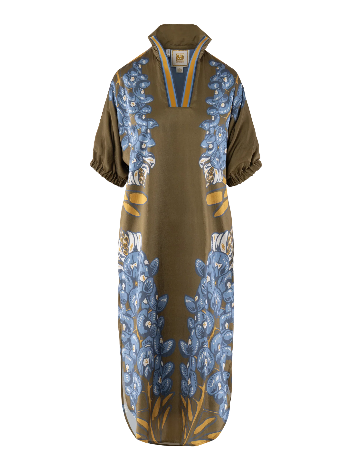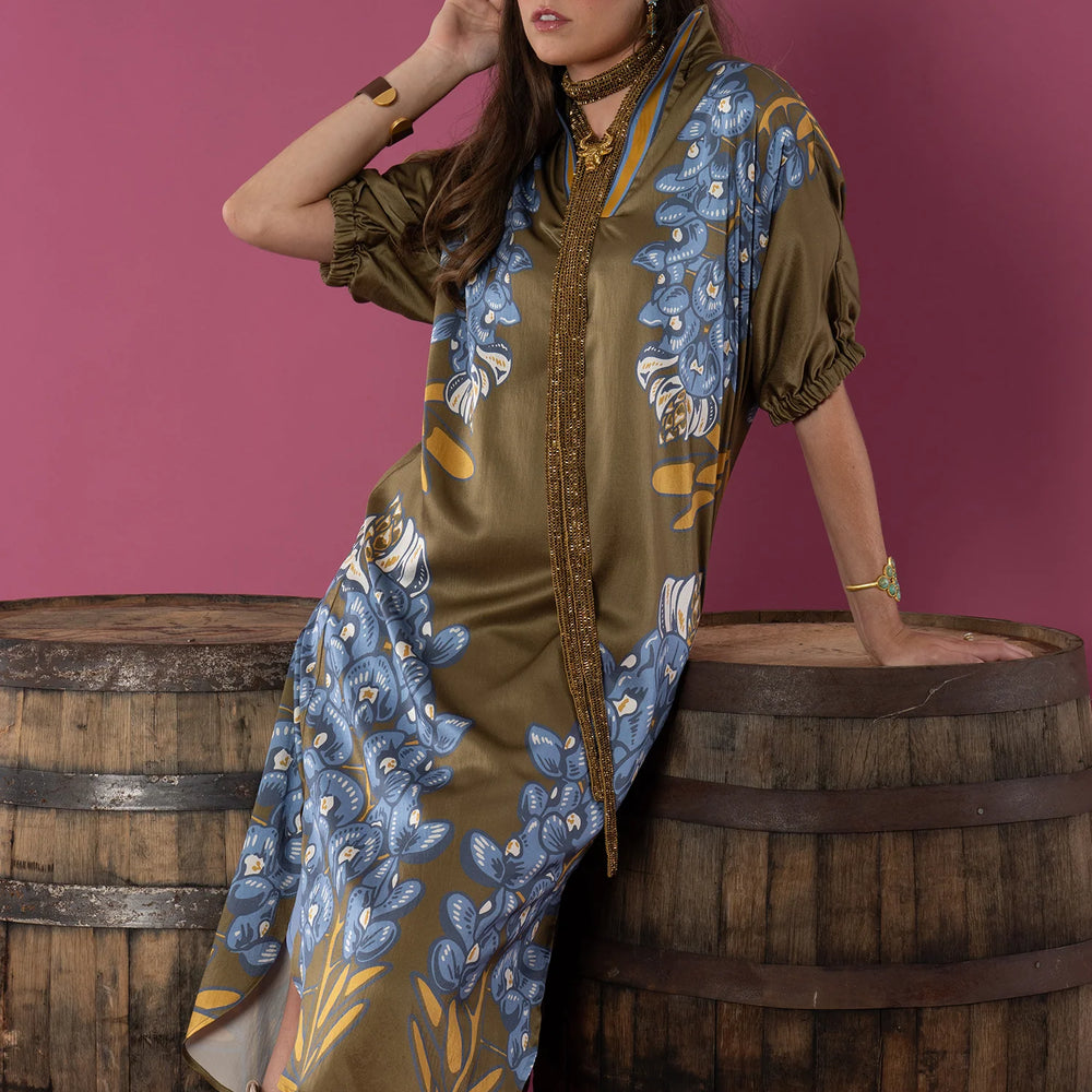 The Poppy Caftan in Bluebonnet is a relaxed yet elevated silhouette that captures the essence of western charm through the Texas state flower. Designed with loose elastic dolman sleeves and a classic stand collar, it drapes effortlessly in a loose-fitting shape that flatters while offering all-day comfort. The curved shirttail hem and side slits add fluidity and ease of movement, while the placed print creates a striking vertical effect that elongates the figure. A versatile piece, the Poppy Caftan transitions seamlessly from day to evening with its effortless sophistication.