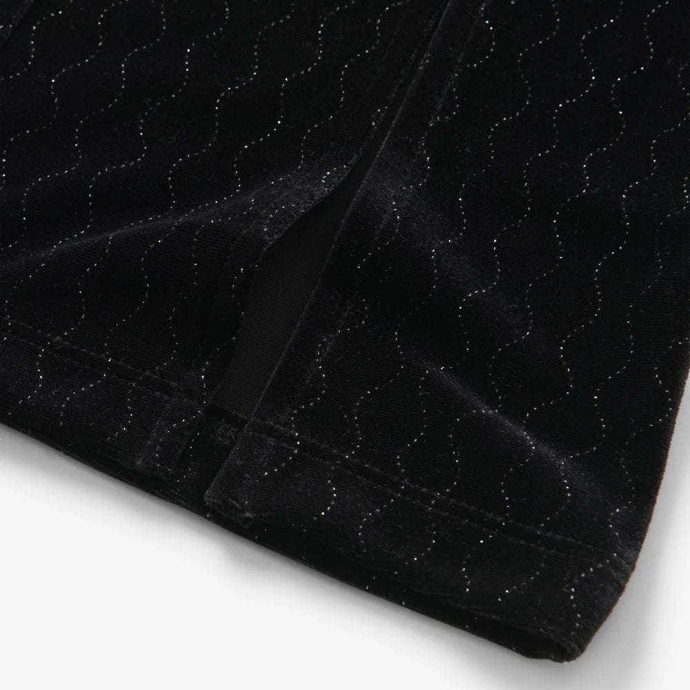 Let her shine with every step in the Girls Black Sparkle Wave Velour Flared Pants, crafted from soft stretch velour for a perfect mix of comfort and glam. They feature a sleek black base accented with subtle wavy lines that shimmer as they catch the light, adding a fun and stylish twist. Designed with an elastic waistband for easy wear and gentle slits at the center front of each leg opening, they offer both comfort and flair.