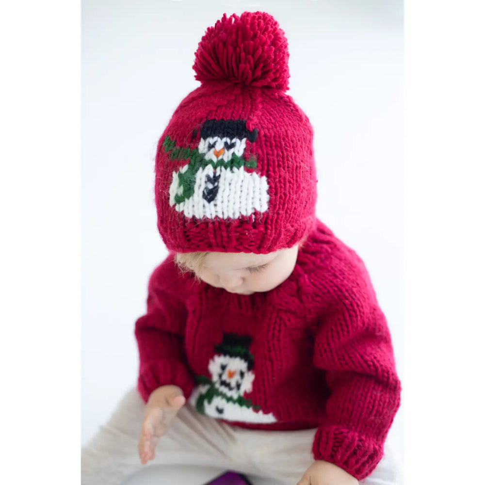 This charming hand-knit sweater features an adorable Frosty the snowman design on the front, perfect for the winter season. The deep red color and chunky yarn give it a cozy feel, while the raglan sleeves with cable knit detailing add a touch of sophistication. The soft neckline ensures easy dressing for your little one, making it a practical choice for busy mornings. Plus, our commitment to sustainability means that this sweater is partially made from recycled Polyester yarn, helping to reduce plastic pollution. Complete the look with the matching hat for a coordinated outfit that is both stylish and eco-friendly. Get your child ready for the colder months in this unique and planet-friendly sweater.