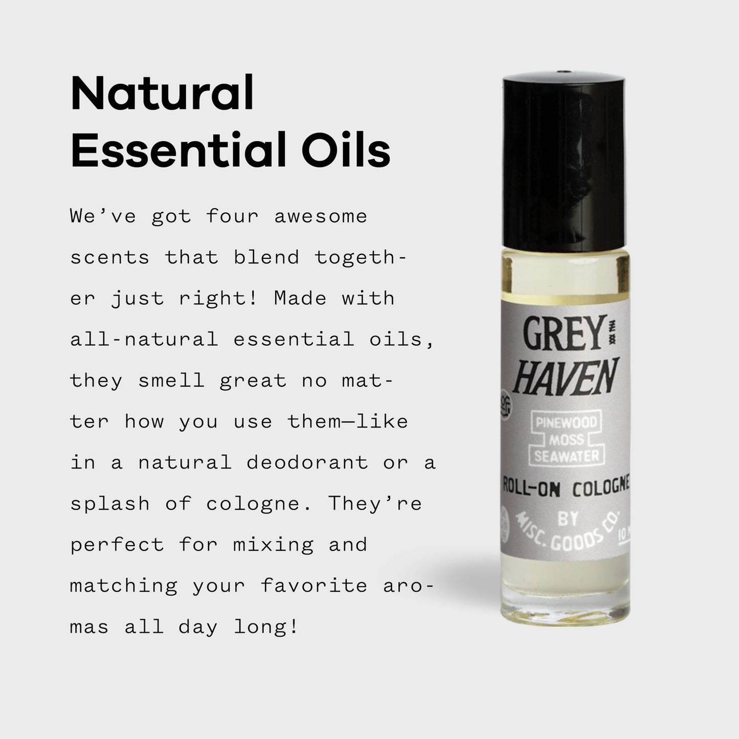 NATURE'S NATURAL FRAGRANCE BLEND: Immerse yourself with our unique and meticulously crafted earthy scents from Misc. Goods Co. Greyhaven Eau De Cologne a fragrance inspired by the complex aromas of the earth and the relaxing scent of coastal fresh air. A serene refreshing scent that lasts all throughout the day.