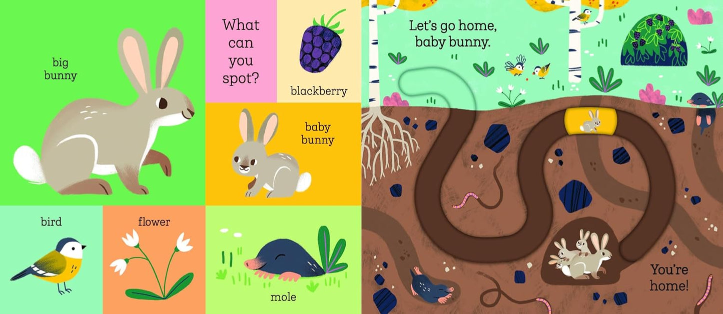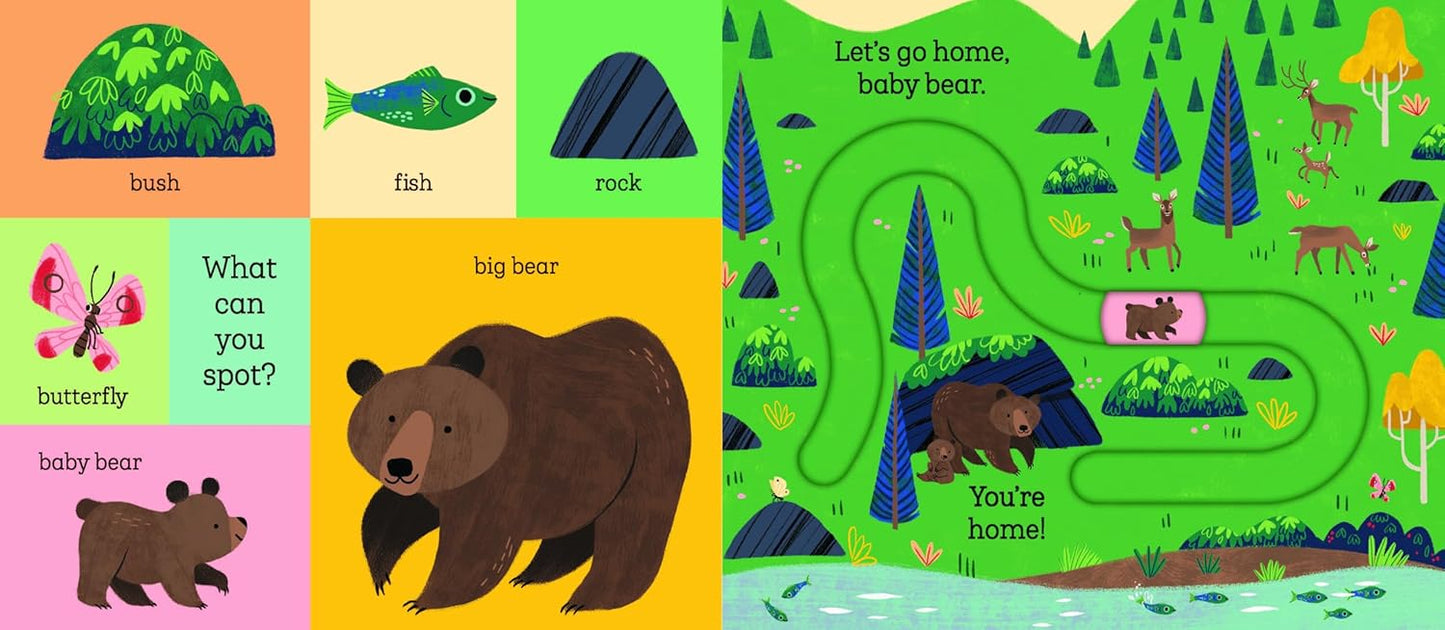Meet rabbit, fox, bear and owl—four adorable baby animals who are lost in the woods! With easy-to-use moving parts and four unique tracks to develop hand-eye coordination and concentration, babies and toddlers will enjoy taking the baby animals home in this robust, satisfying board book. Scan the Stories Aloud QR code on the back cover to read along with the story!