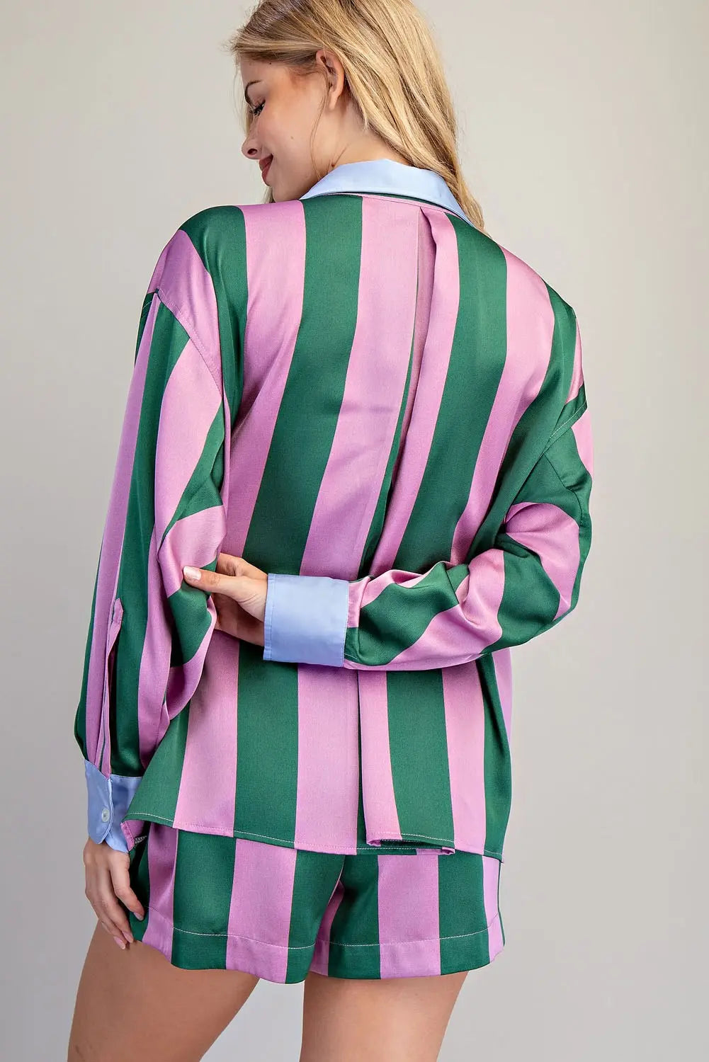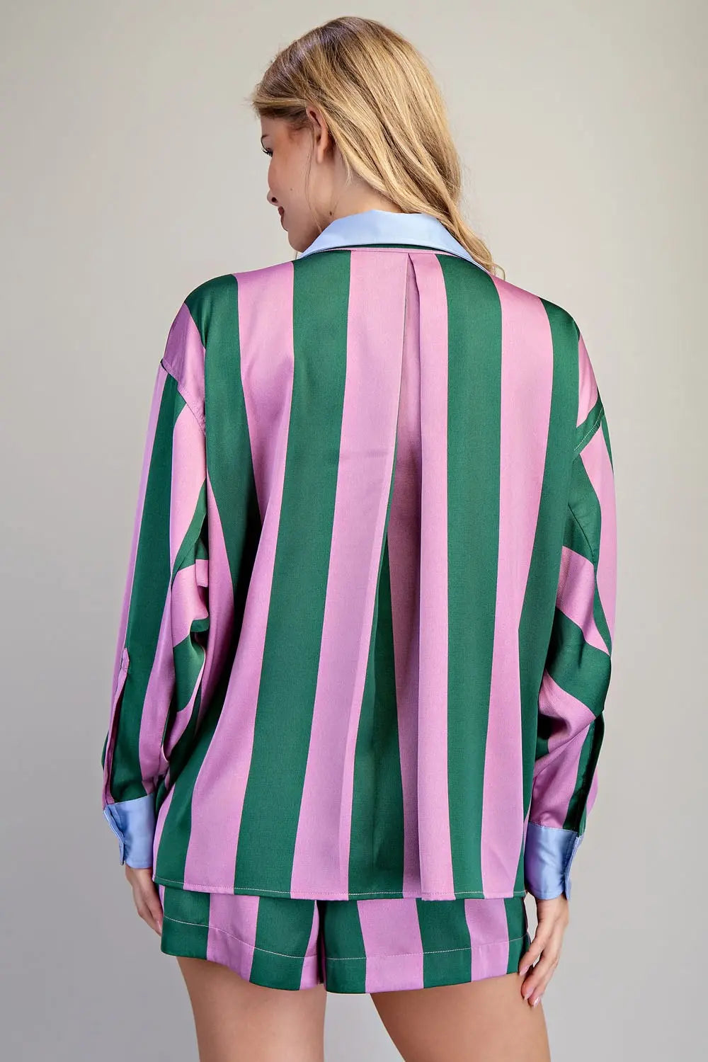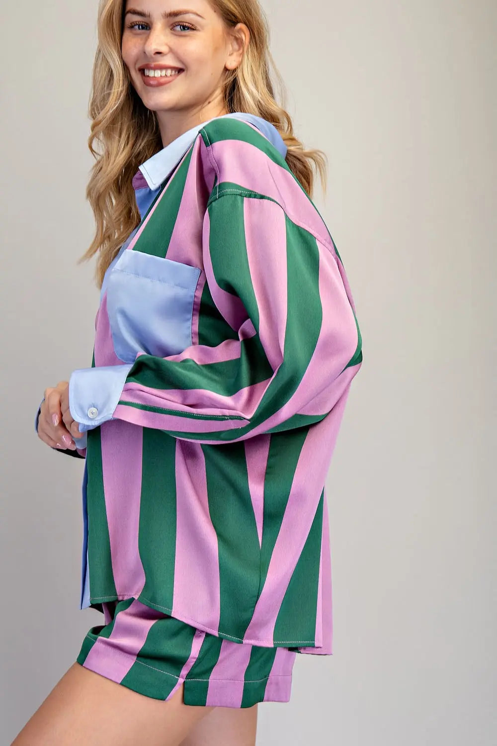 This coordinated set features a relaxed button down shirt with a contrast point collar, chest pocket, long sleeves with button cuffs, and back box pleat, paired with matching high rise shorts designed with a contrast elastic waistband, faux button fly, side slits, and bold vertical stripes for a playful yet polished look.