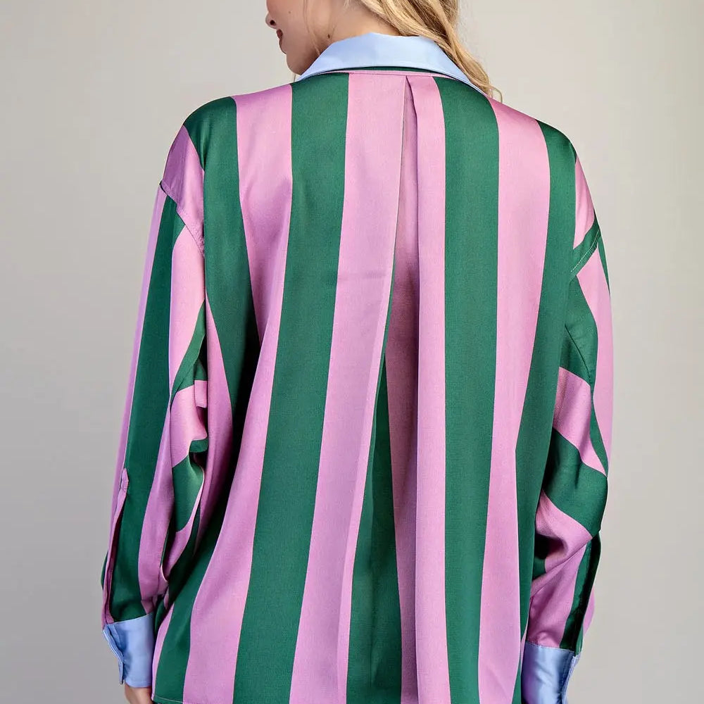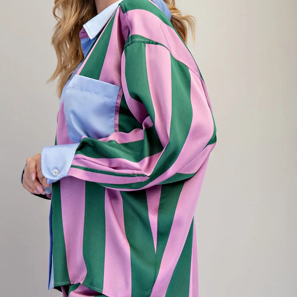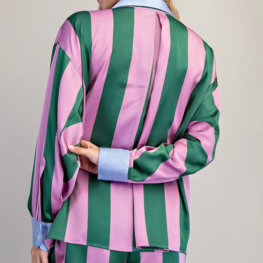 This coordinated set features a relaxed button down shirt with a contrast point collar, chest pocket, long sleeves with button cuffs, and back box pleat, paired with matching high rise shorts designed with a contrast elastic waistband, faux button fly, side slits, and bold vertical stripes for a playful yet polished look.