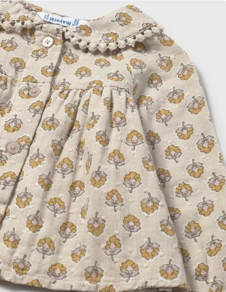 Long sleeved Blouse with elasticated cuffs for baby. Baby neck. Button fastenings down the front. 100% cotton.