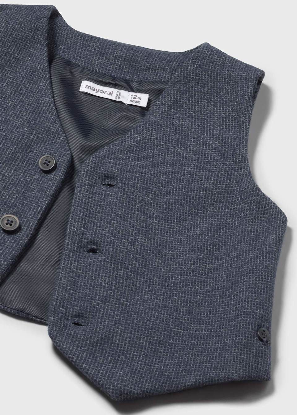 Vest for baby. V-neck design. Button fastenings down the front. Soft polyester inner lining.