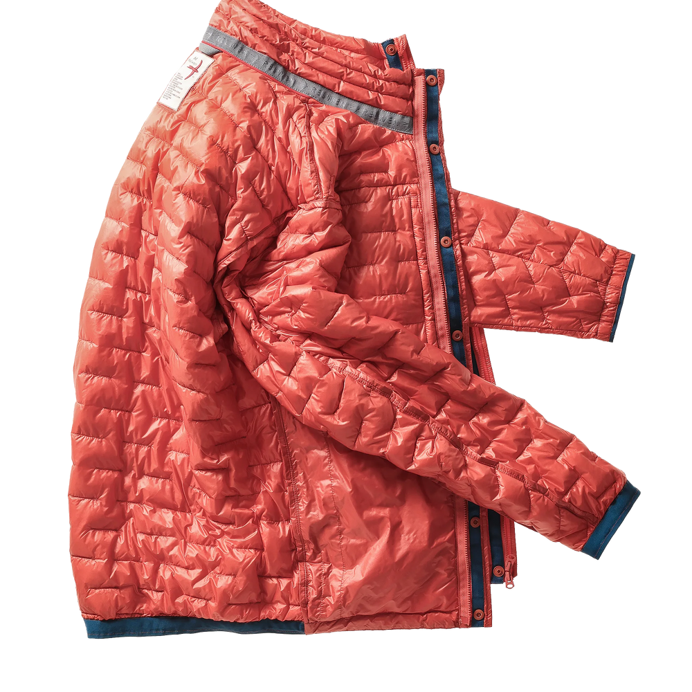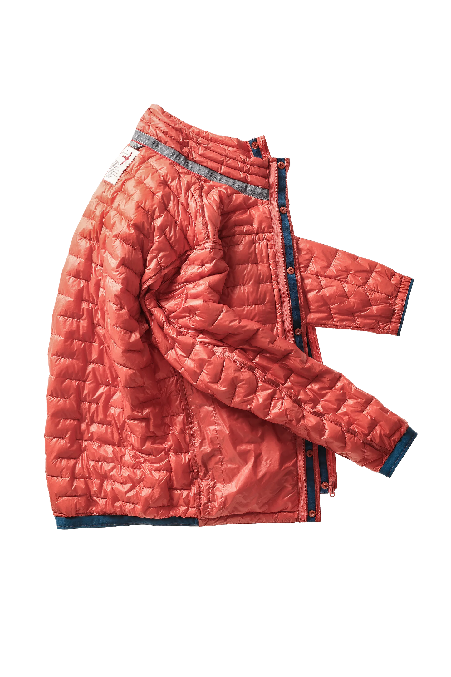 The lightest jacket we’ve ever produced. Weighing-in at 265 grams, about ½ a pound, our latest down design was created to be invisible to the wearer. As warm as jackets 6x its weight, you can wear it like a thin cardigan just snapping a few buttons closed for easy venting on those warmer days…or seal-up to the chin with its tall, shaped collar. A jacket with infinite wearability that’s easily compressed to the size of one hand pocket.