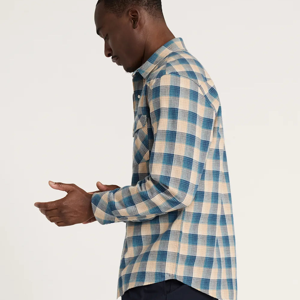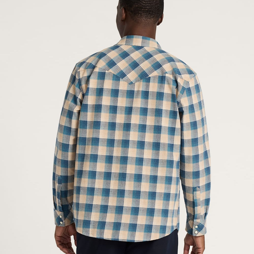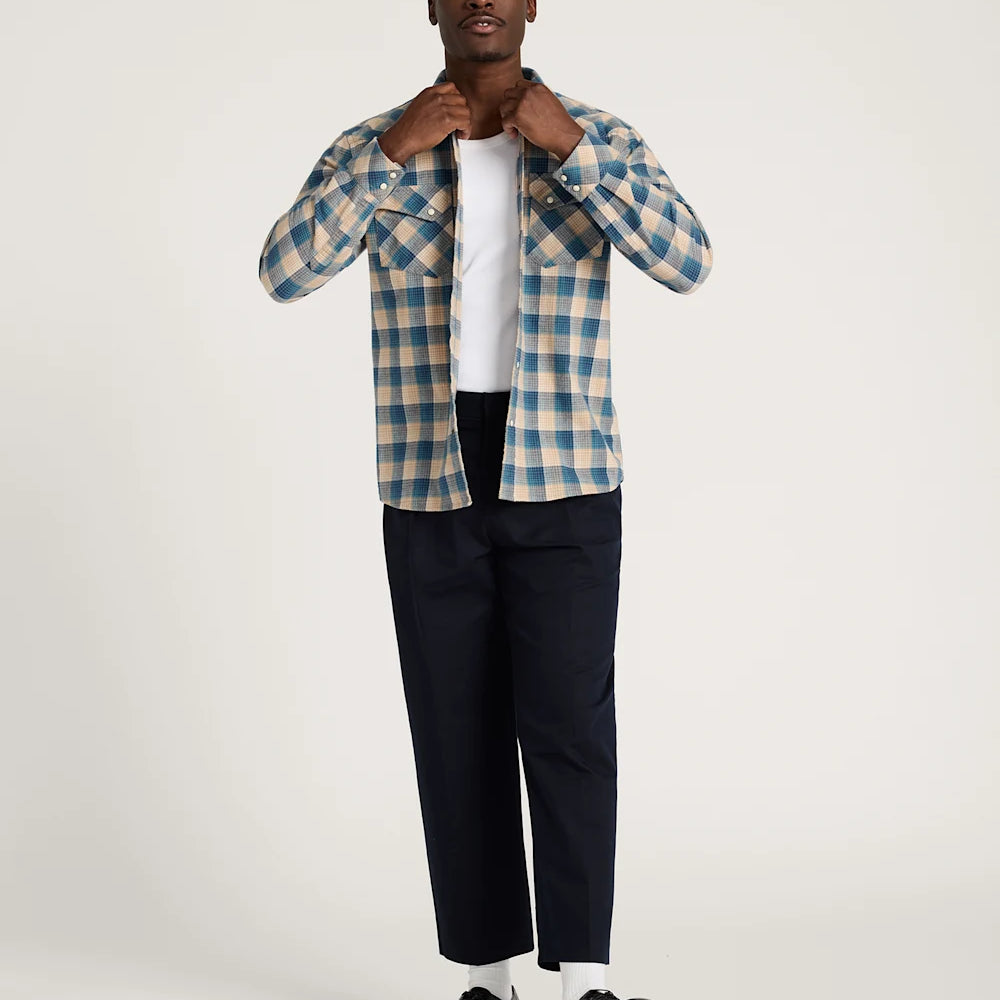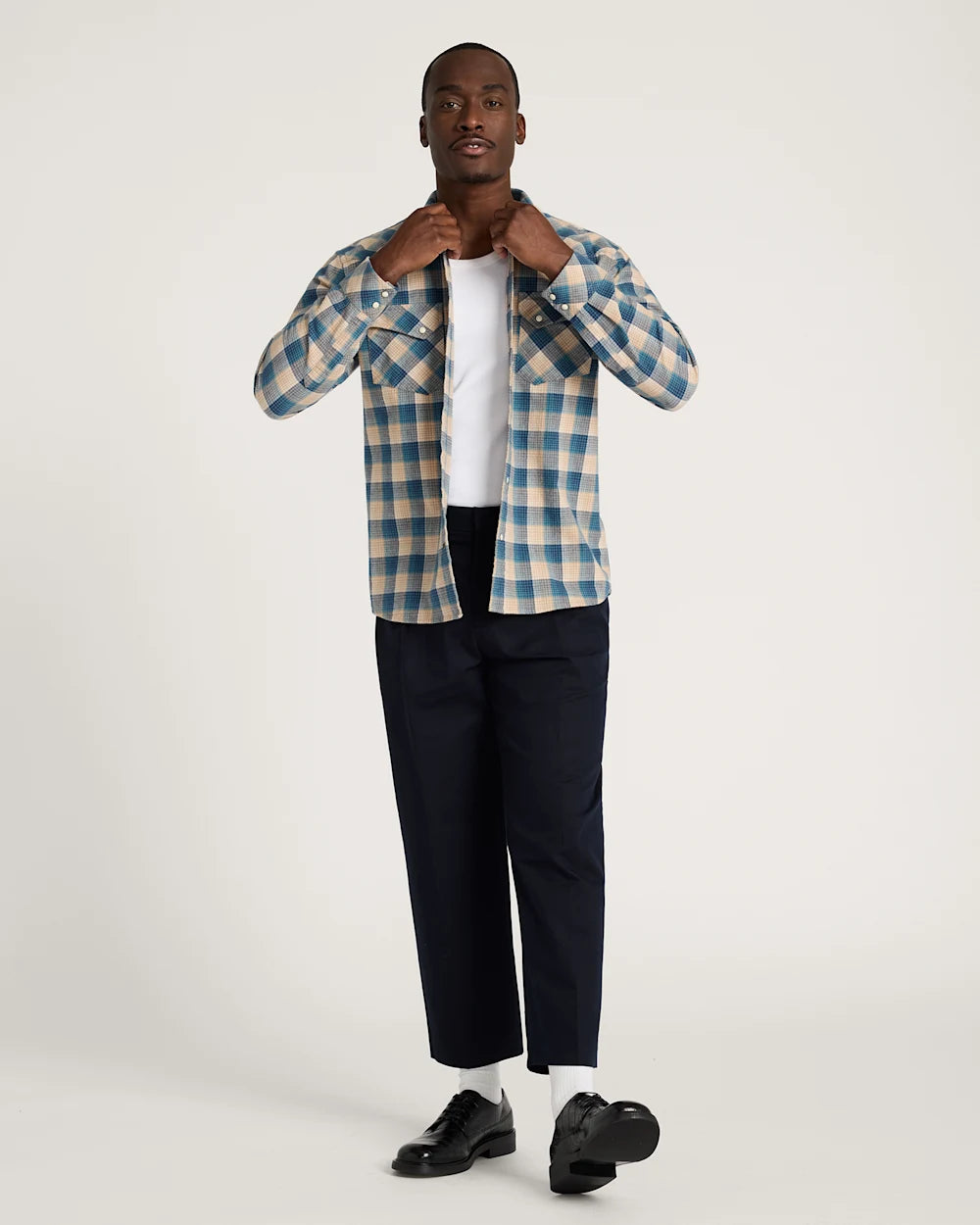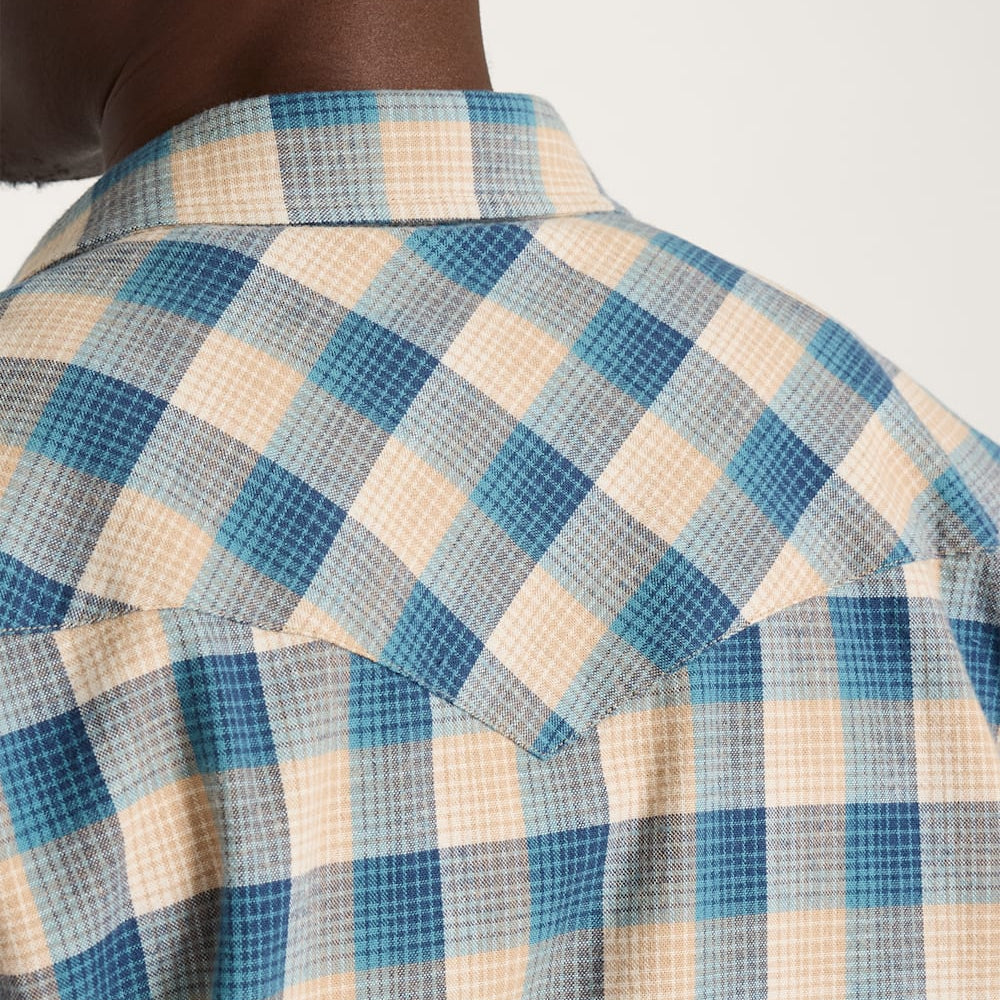 his Western-inspired snap-front shirt offers an easygoing silhouette in cotton twill. Featuring flap pockets, peaked yokes, and curved hem, it's finished in seasonal plaids with heritage Pendleton flair. Ideal for casual layering or everyday wear.