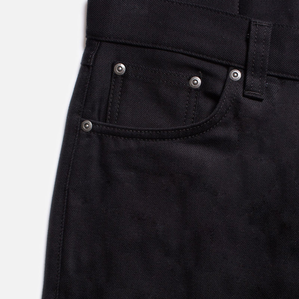 Normally, when denim is dyed part of the dye will absorb in the cotton fibers while the rest remains bound only to the surface of the yarns. This is what gives denim its aging property that in many cases is sought after. However, when it comes to black jeans this is not always the case which is why we developed the Everblack denim. The technical difference between Everblack and regular black denim is that it utilizes a method and type of dyestuff that allows improved absorption as well as a stronger fixation. This results in denim with a significantly greater colorfastness, which does not fade with wearing and washing