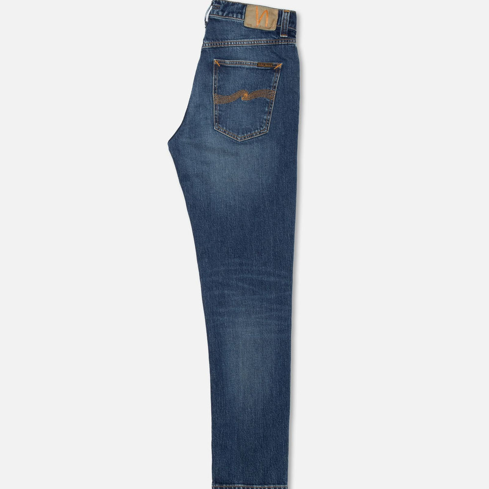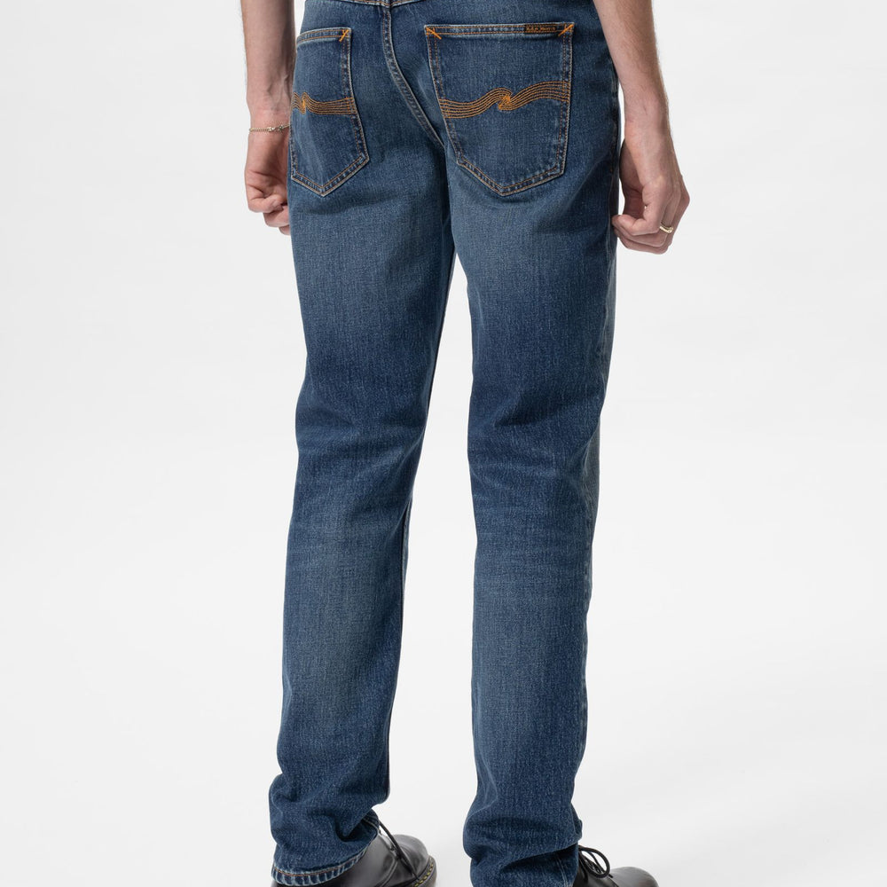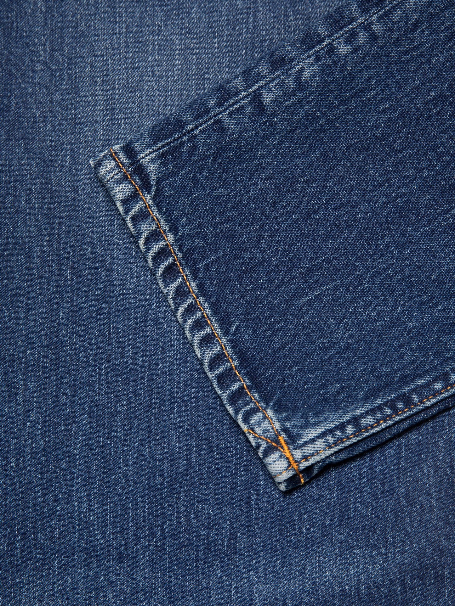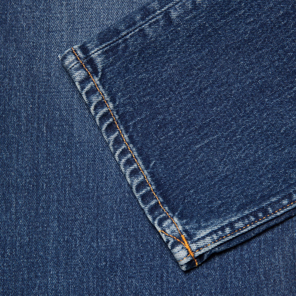 Slim fit jeans with a slim leg in a dark blue wash featuring authentic wear. Crafted from remarkably textural stretch denim, the wash exudes a rich yarn slub character, showcasing both a salt 'n pepper grain and a subtle crosshatch. Highlighting and slightly warm abrasions add an authentically worn-in look to these dark blue beauties..