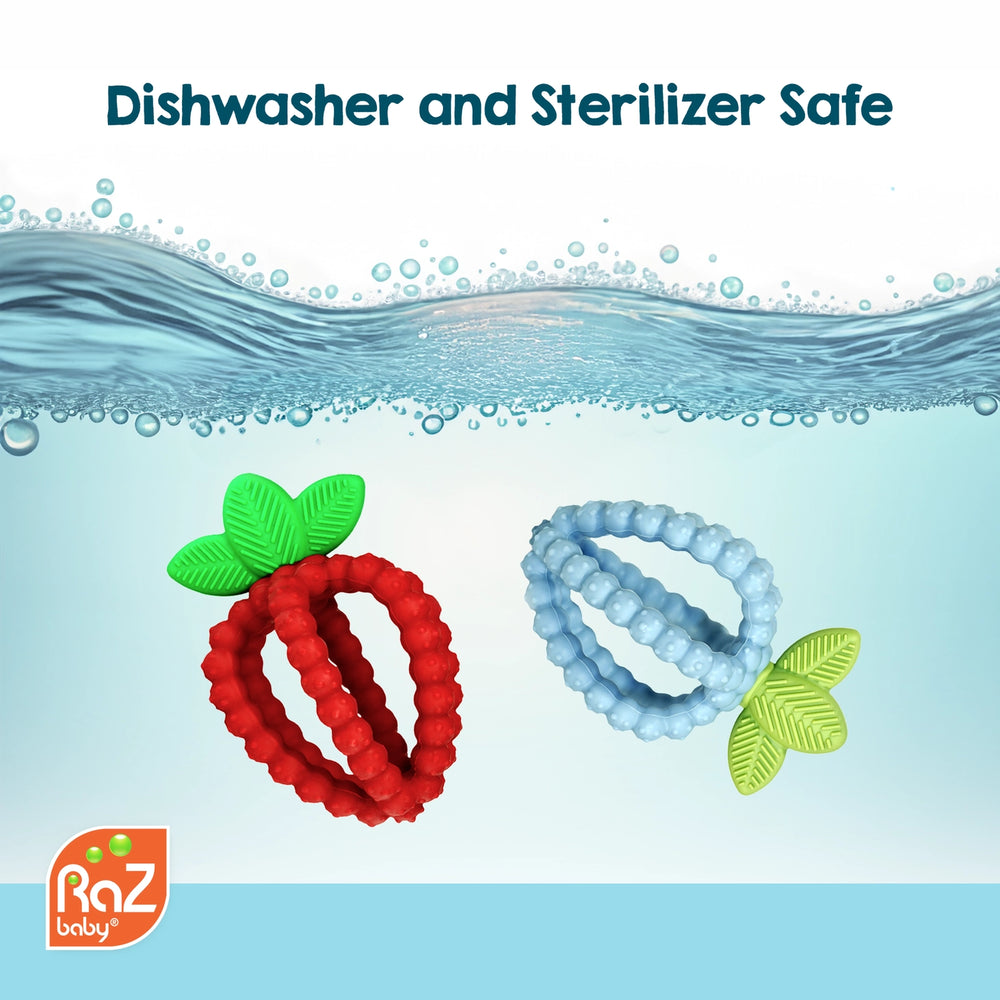 BerryBumps Design: Made of 100% soft silicone with patented BerryBumps to soothe gums. Offers varied textures for chewing and can be frozen without hardening for extra relief.