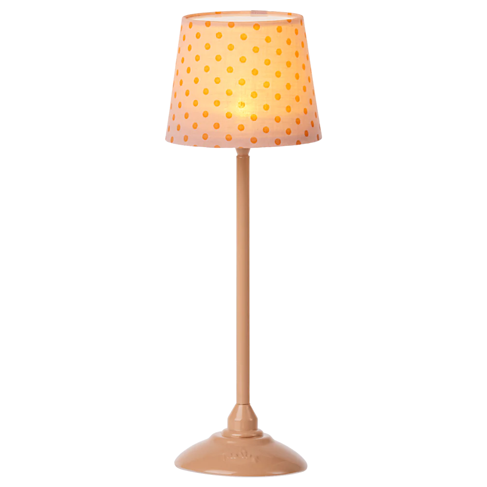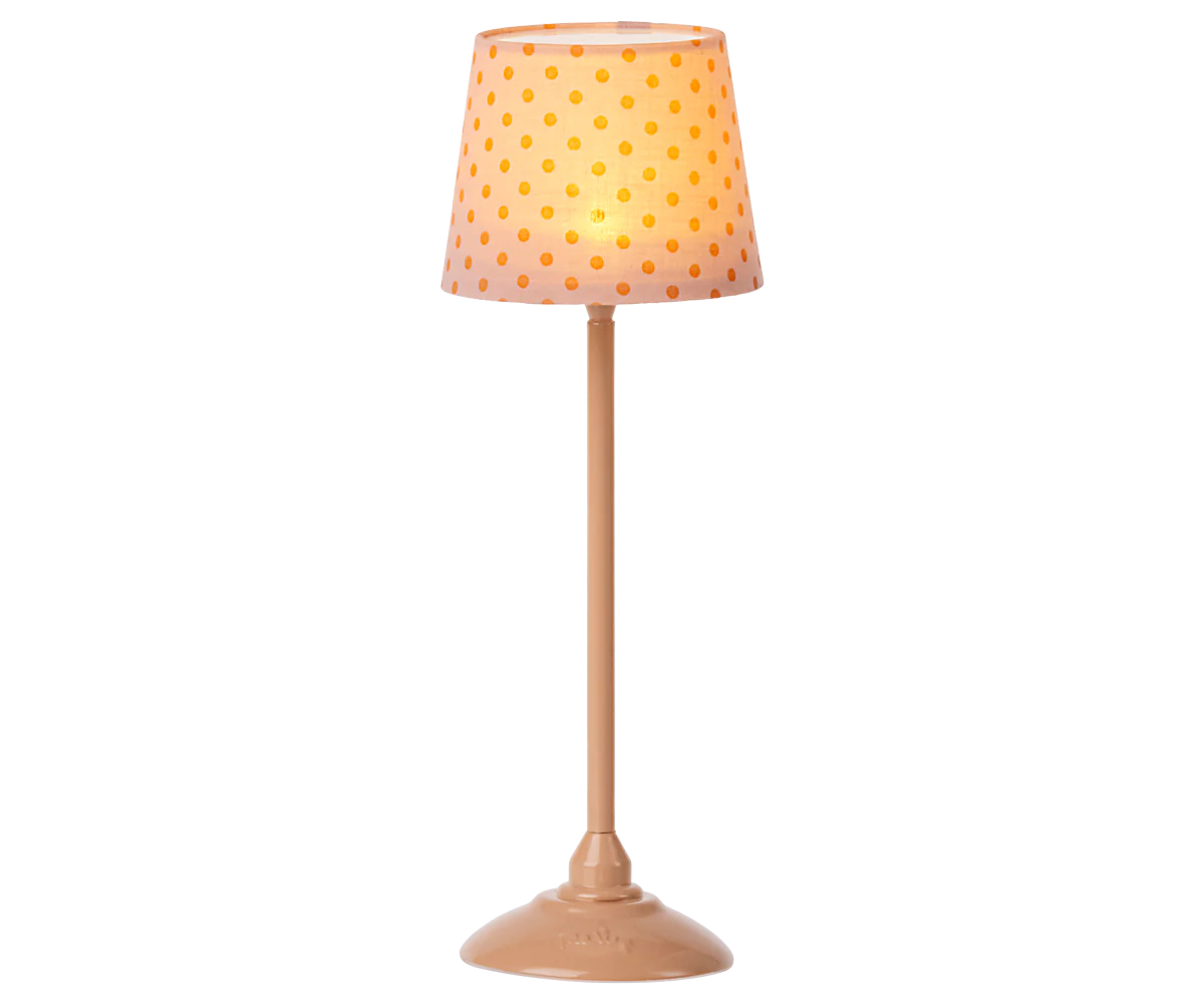 The beautiful Maileg miniature floor lamp is a must-have. The lamp will light up the room with a soft tone - remember to turn off the light when the friends go to bed. The battery can be changed by an adult.