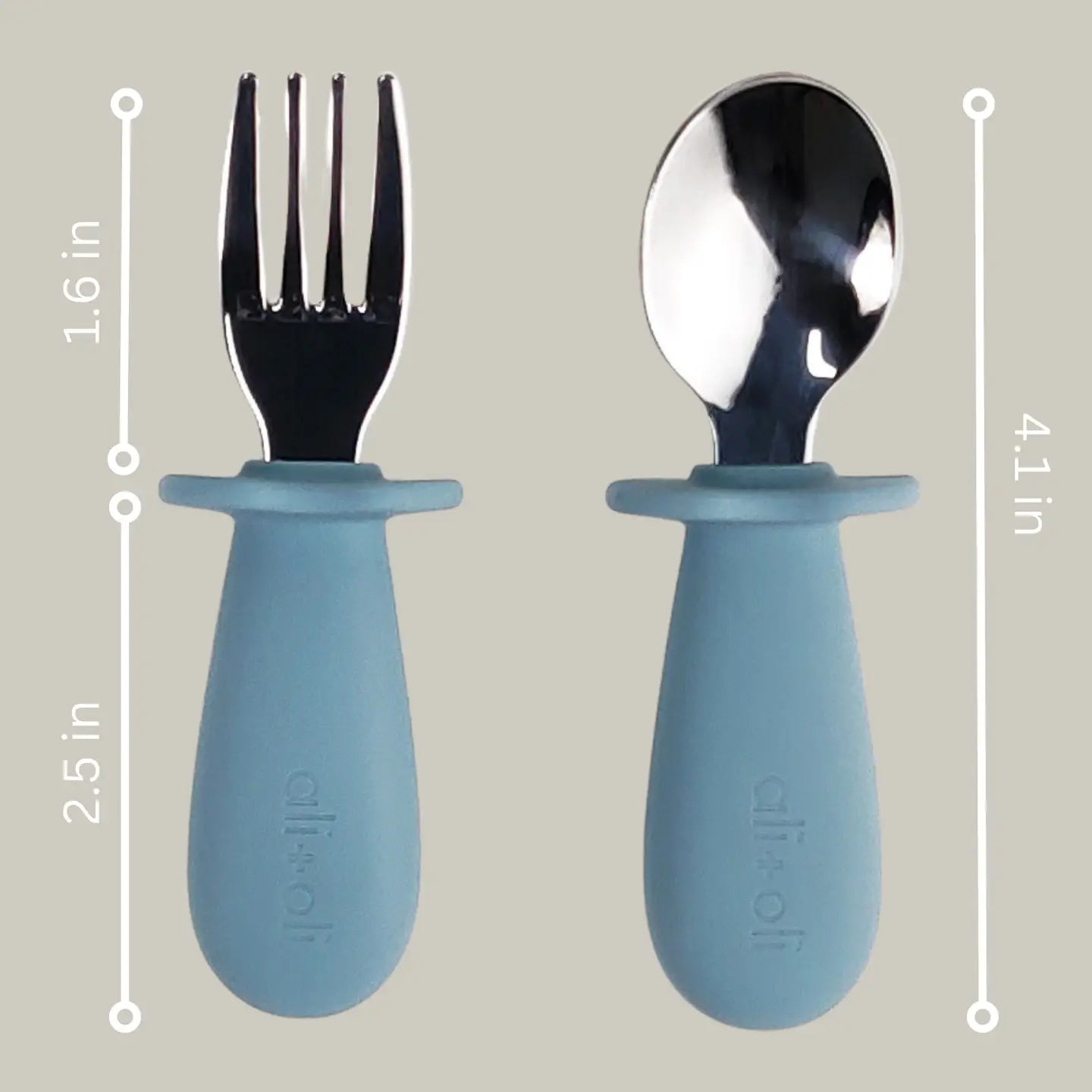 100% Food-grade silicone handle with stainless steel fork and spoon BPA, PVC, Lead, Cadmium & Phthalate Free Superior 316 Stainless Steel construction The anti-choke shield protects your little one Easy-to-grip handles are perfect for any toddler Rounded smooth edges ensure safety Gorgeous Scandinavian and modern colors CPSIA Certified and Tested – Mom-Approved Spoon dimensions: L 4.88 in x W 1.41in x 1 in H (L 12.4 cm x W 3.6 cm x 2.3 H)