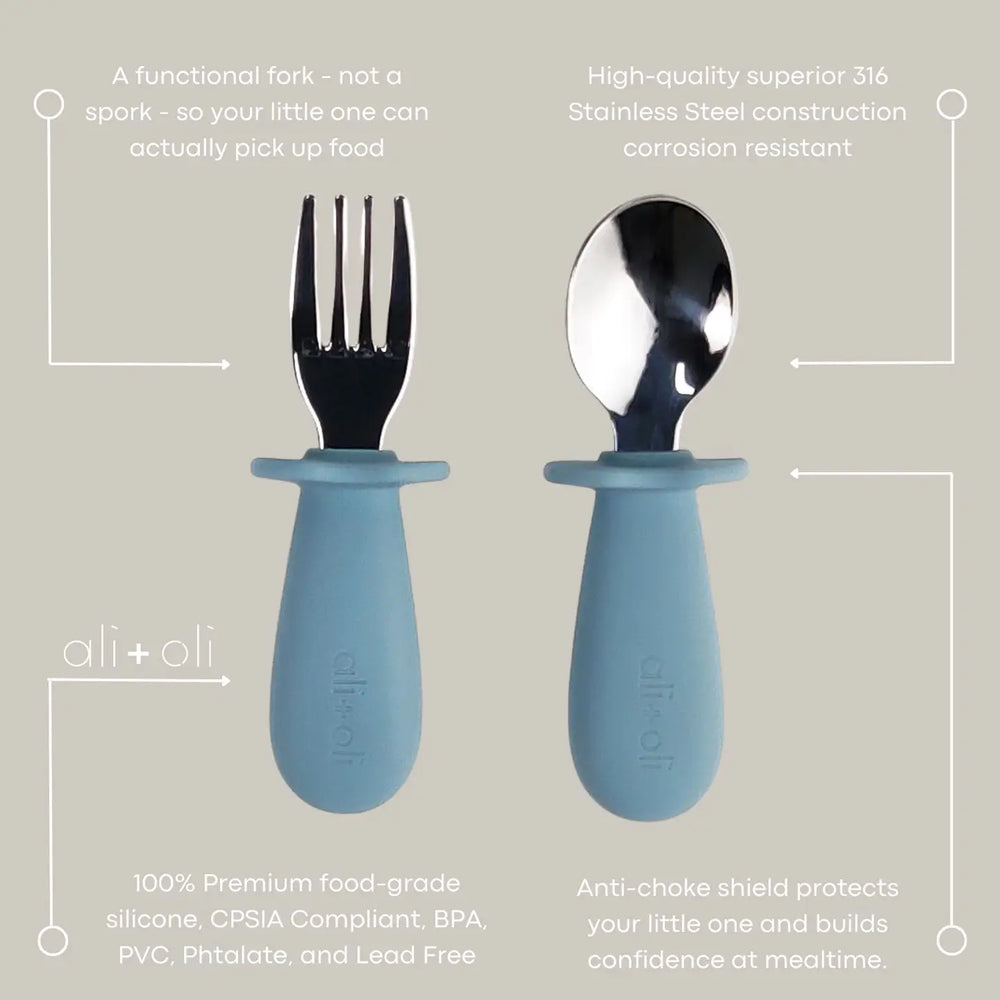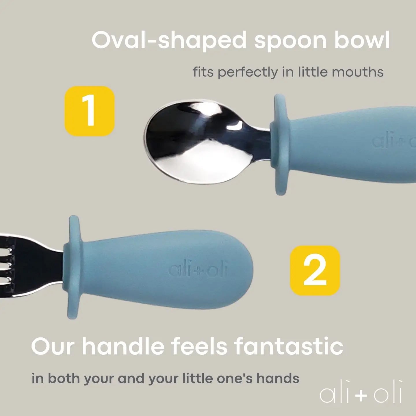 Our toddler learning spoon and fork set is perfectly sized for little hands to encourage self-feeding with chunky easy-grab handles.