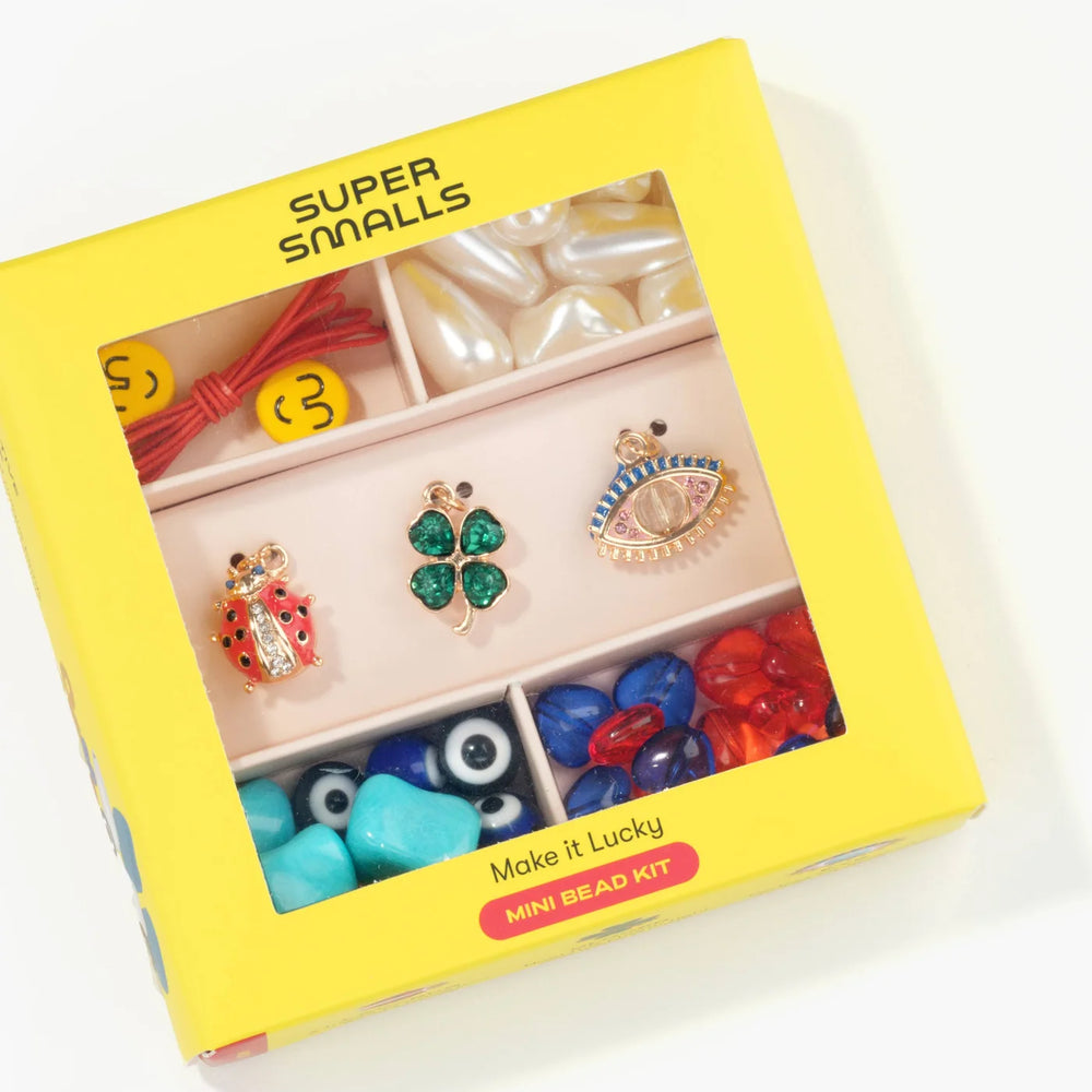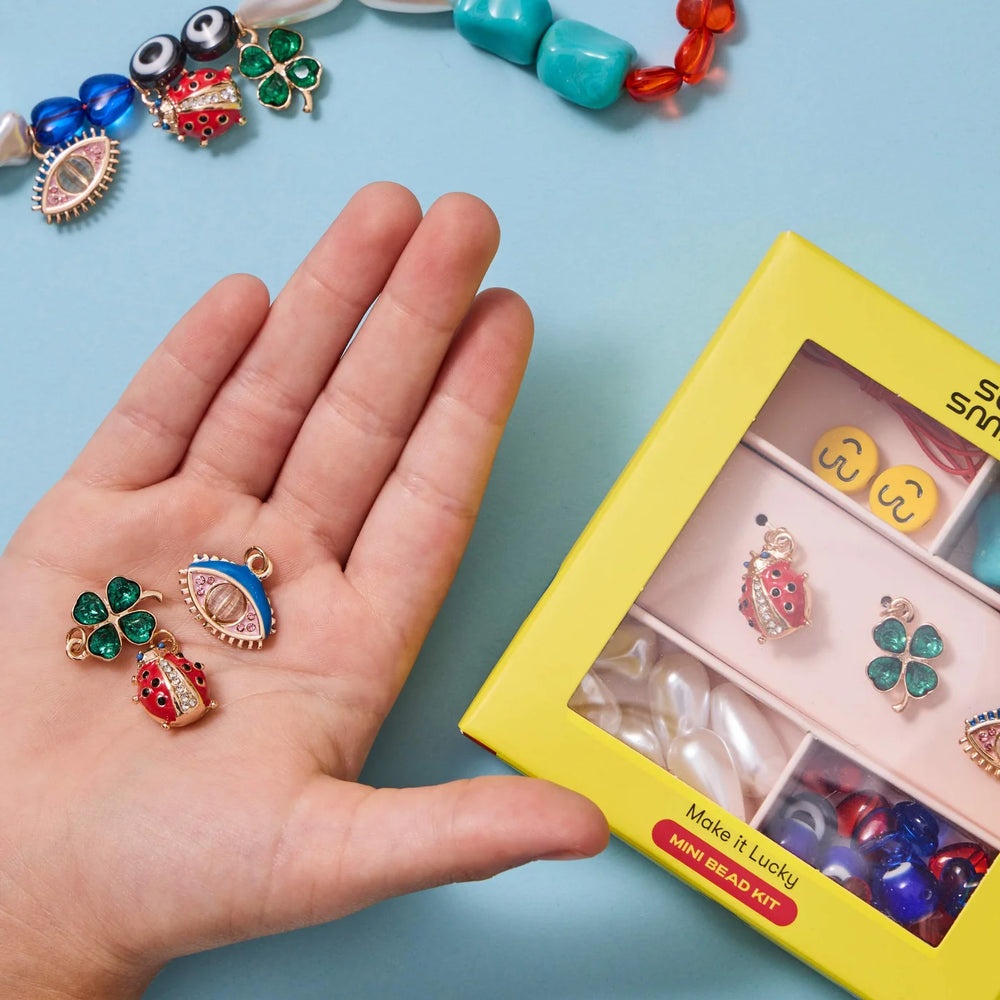 Bring the good vibes into your life with our Make It Lucky Mini Bead Kit! This mini version of our best-selling Bead Kit is perfect for dreaming up and designing your own jewelry with a combination of unique, extra special beads and three charms - a ladybug for good fortune, a clover for making wishes, and an eye for protection. It’s the perfect party favor or activity for your next celebration - you’ll be spreading (and catching) all kinds of positivity.
