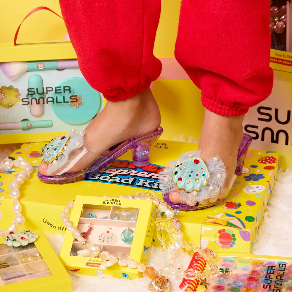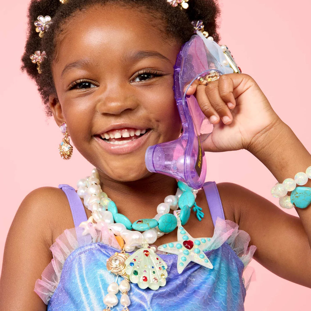 Channel your inner mermaid with the Mermaid Dreams Play Shoes! These sparkling purple shoes are designed for ultimate dress-up delight, featuring a stunning oversized gem-covered seashell jewel and enchanting blue tulle accents. The heels are filled with glimmering gems and pearls that make every step a magical experience. Perfect for transforming playtime into a mystical underwater journey, these shoes will make you the star of any dress-up occasion!