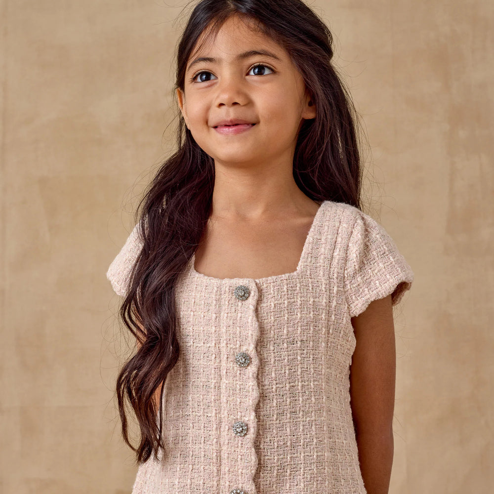 Our Gabrielle Dress brings timeless elegance with its tailored tweed fabric and classic silhouette. Featuring a curved neckline, side zipper, short sleeves, and decorative floral buttons, this charming style is finished with scalloped edges along the placket and hem for an extra-special touch.