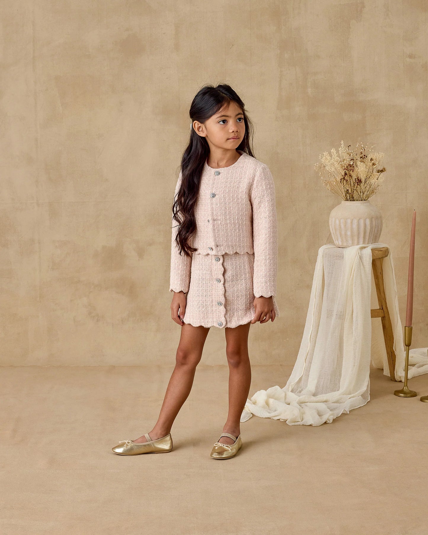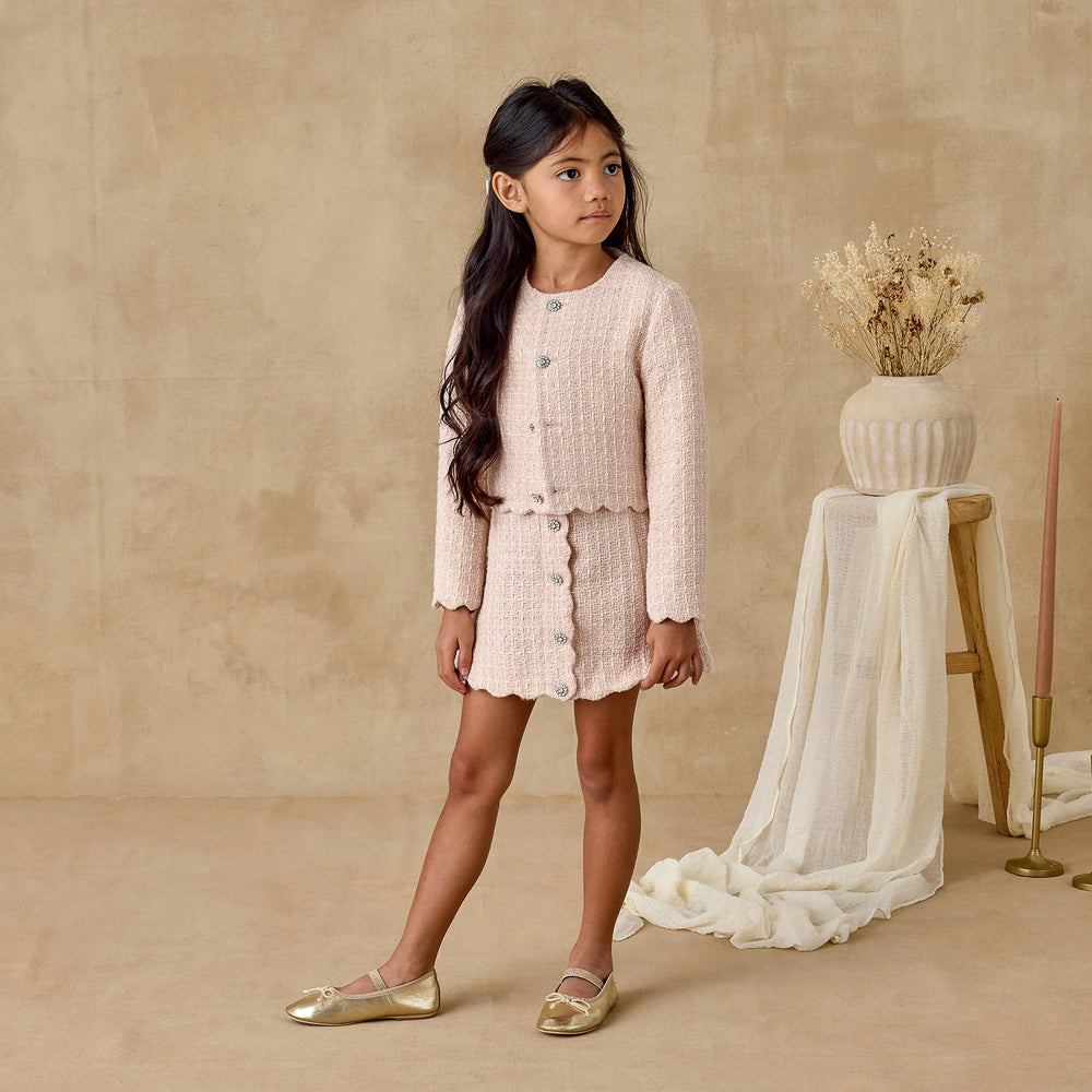 Our Tweed Jacket brings timeless elegance with its tailored silhouette and classic texture. Featuring a curved neckline, decorative floral buttons, and scalloped edges, it’s a charming layer for any special occasion. Pair with our Gabrielle Dress for a perfectly polished, coordinated look.