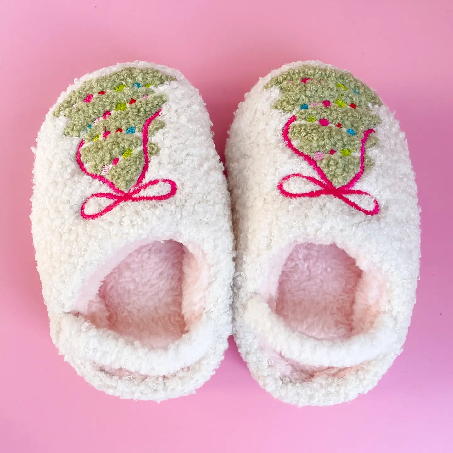 Pink Bow Christmas Tree slippers, now in toddler sizes! Perfect for your little cutie during the holiday season.