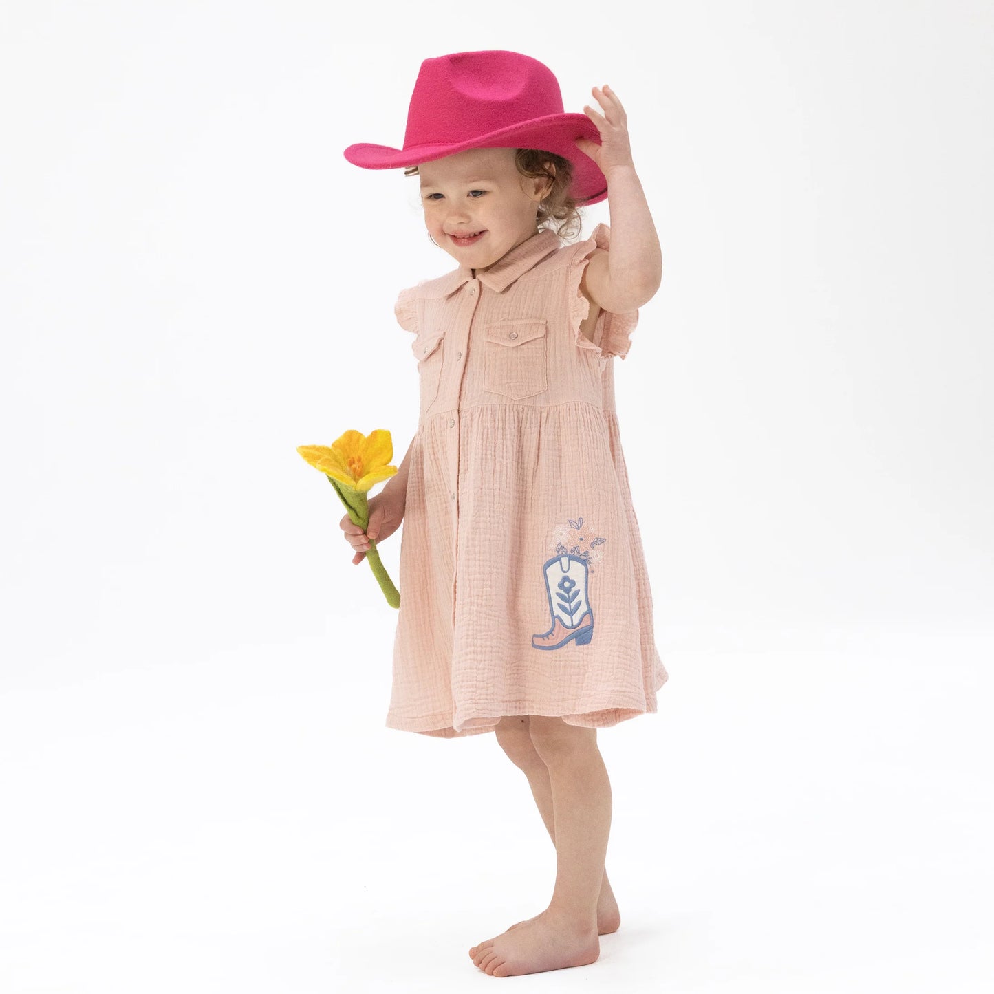 Little cowgirls will be ready for twirls and adventures in our Western Pearl Snap Dress & Bloomer! Made from soft, breathable organic cotton muslin, this lightweight dress is gentle on delicate skin and perfect for all-day wear. The front features a charming cowgirl boot applique, while the back shows off a playful “Yee Haw” rope heart applique adding fun, western-inspired style from every angle.