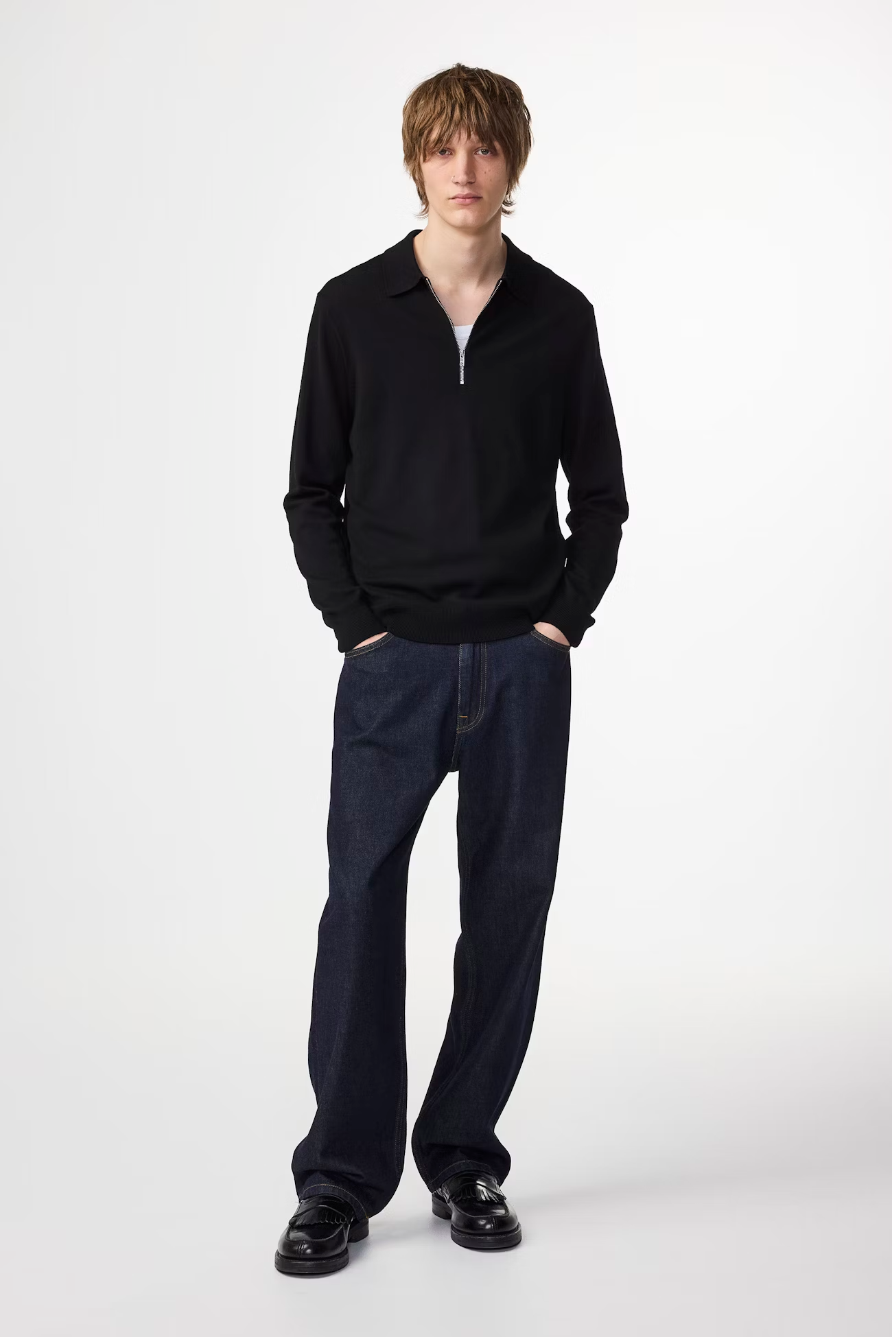 Zip-up polo crafted in a smooth wool. Knit in a plain stitch with a neat rib along the hem and cuff and topped with a YKK zipper closure.