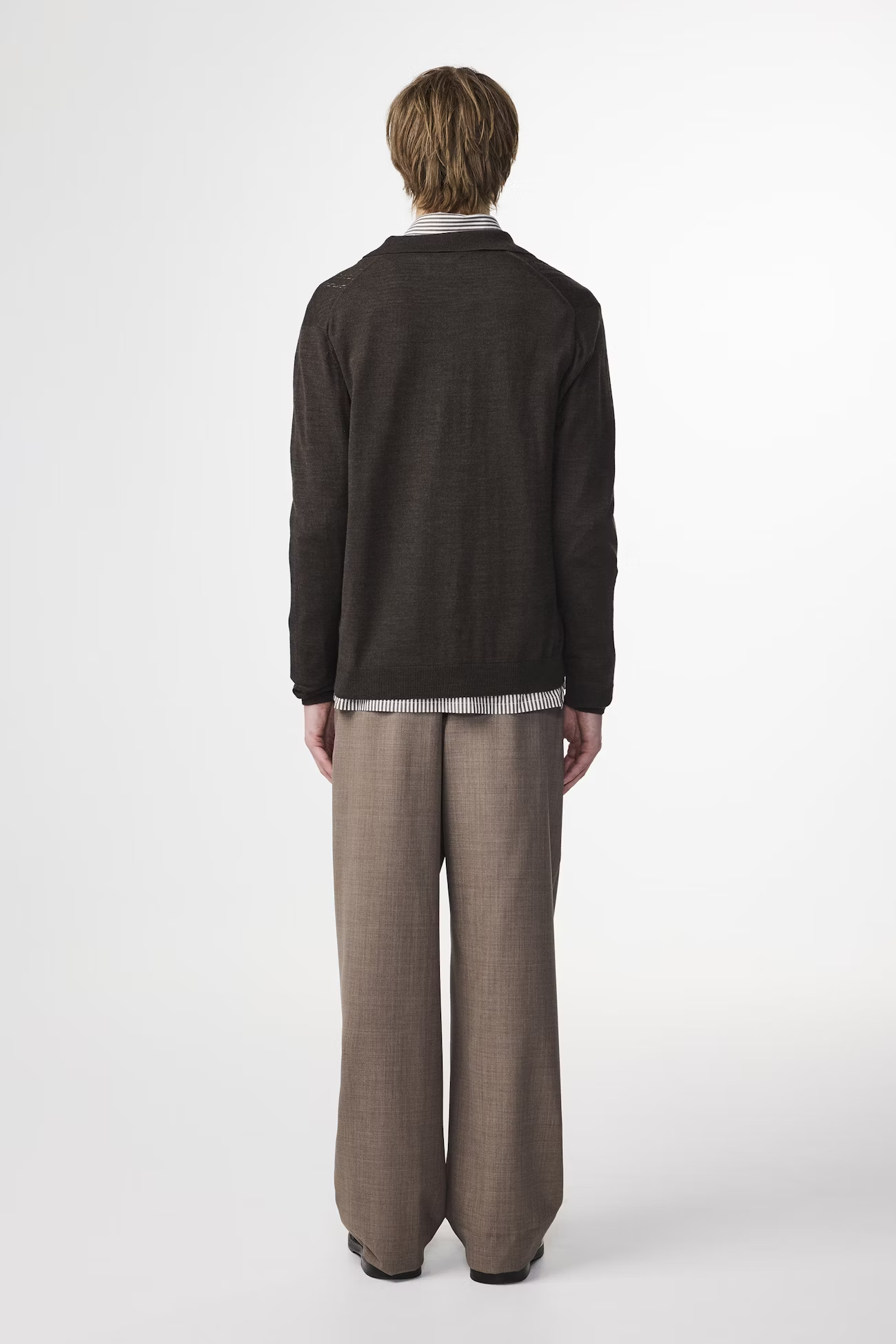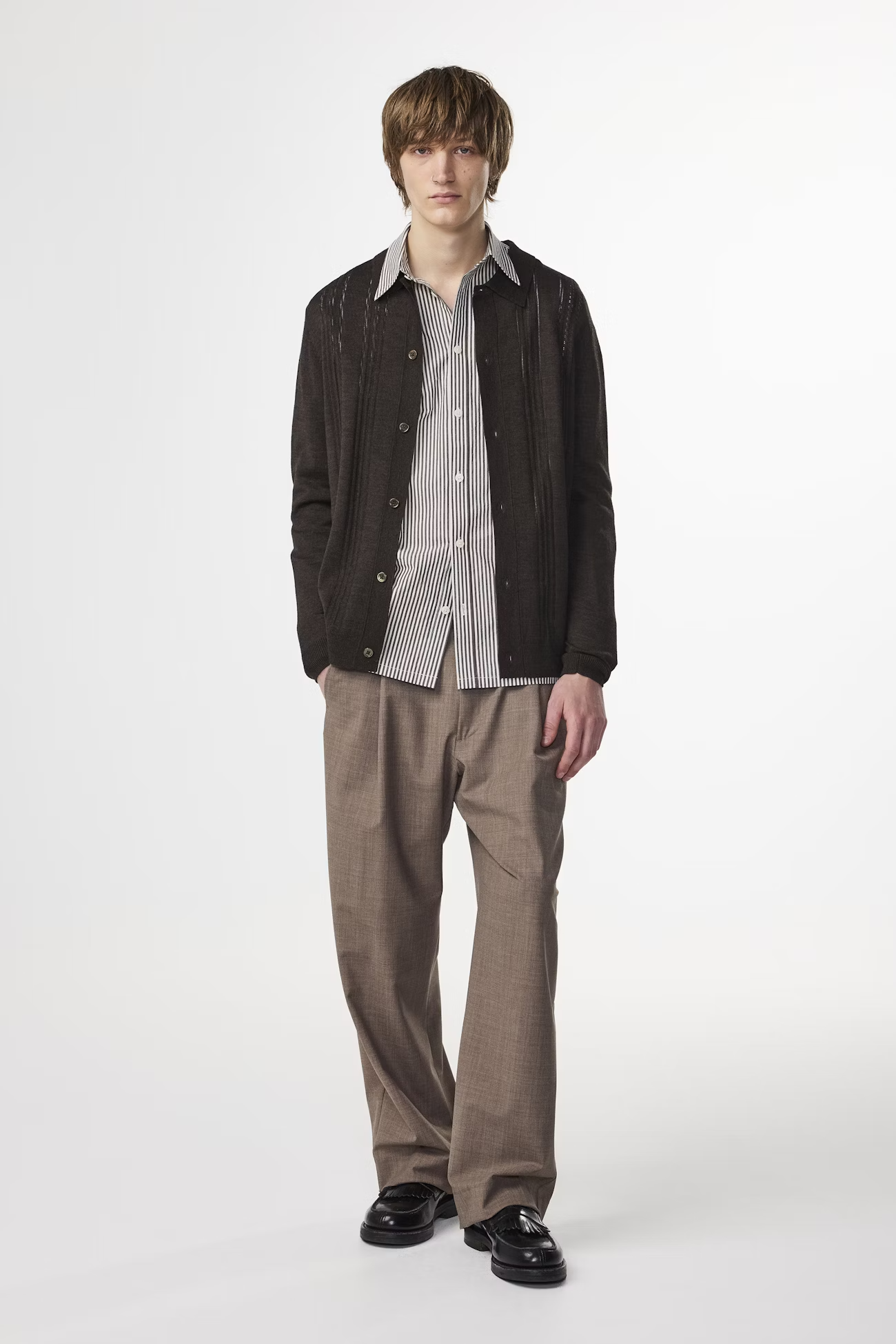 Lightweight polo cardigan crafted in a soft responsible wool blend with a touch of stretch. Knitted in pointelle stitch and finished with Mother-of-Pearl buttons.