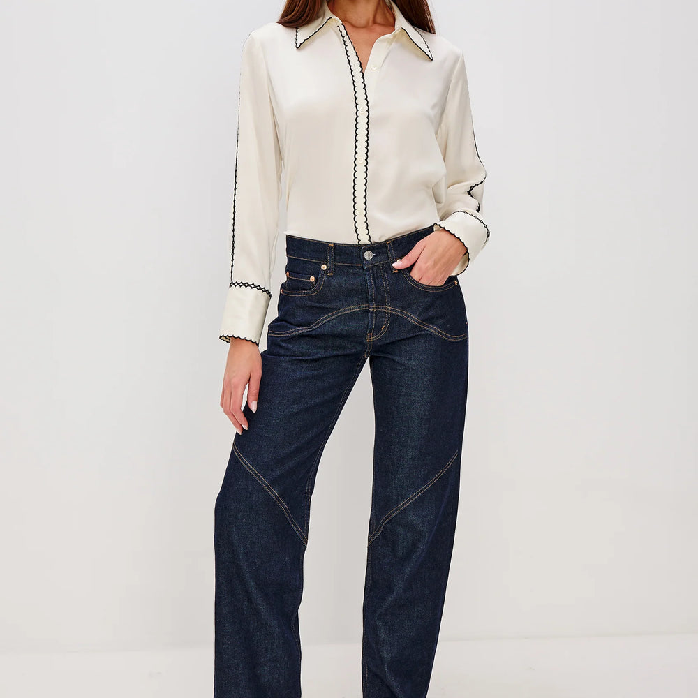 Sophisticated by design, the Aloise is a classic collared shirt in smooth, flowing silk charmeuse, featuring contrast scalloped embroidery with delicate cutouts on the sleeves and front button closures.