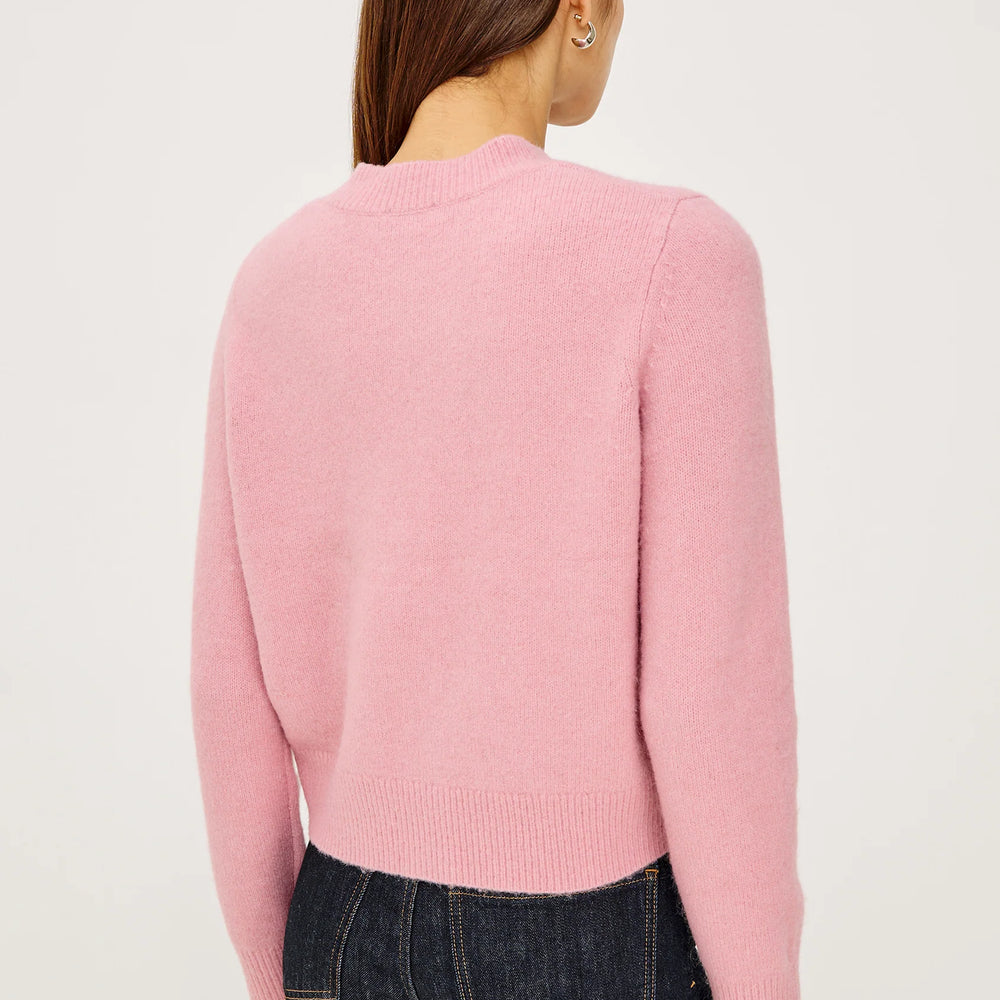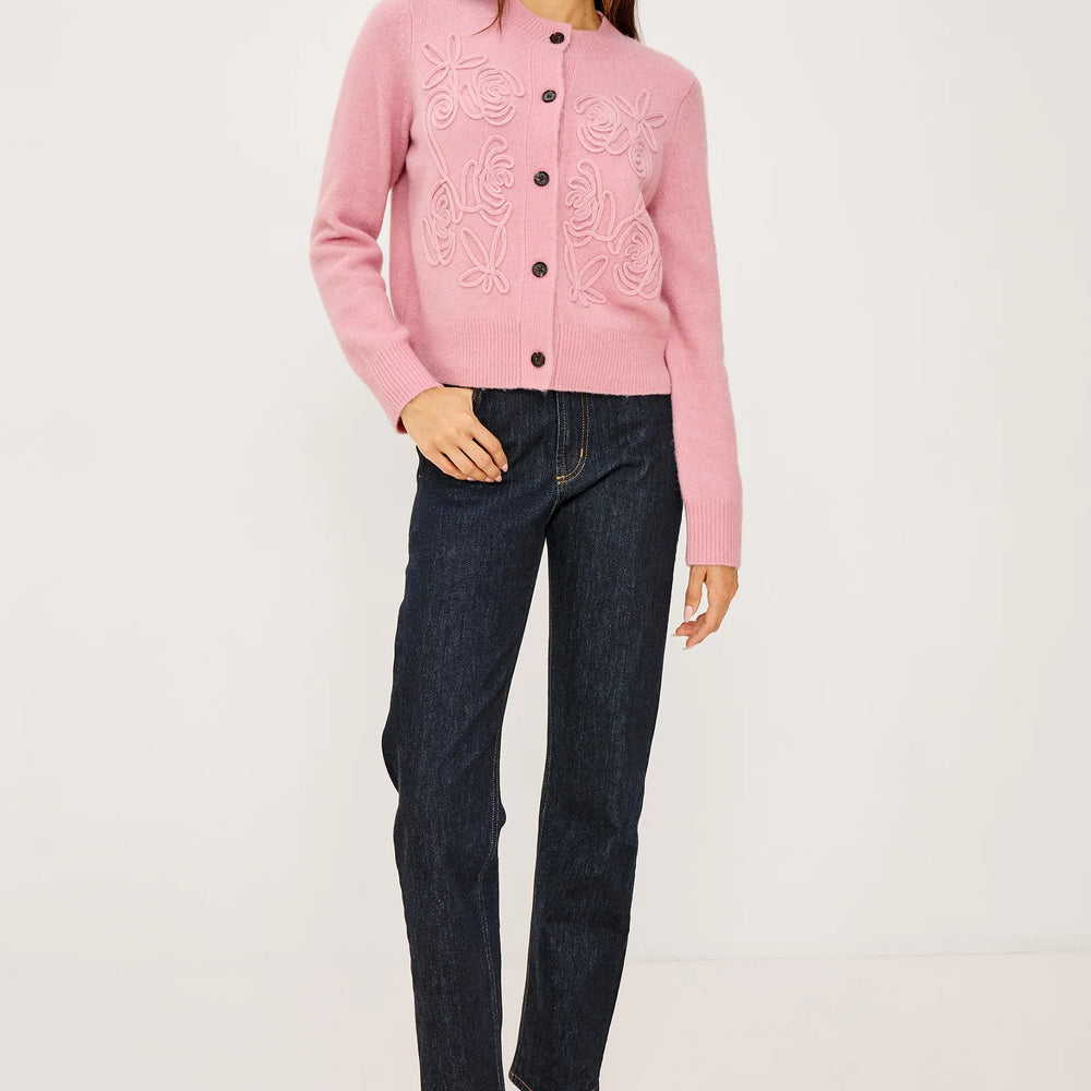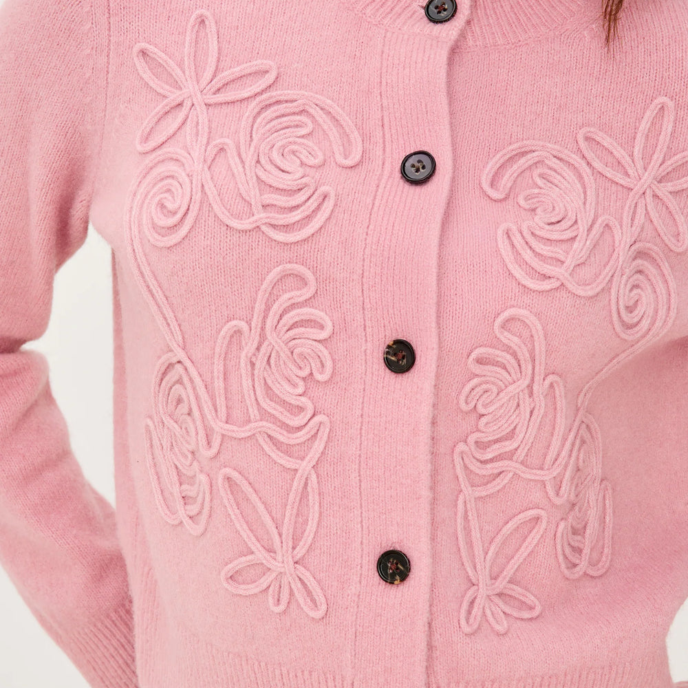Comfort elevated to an art form, the Coralee is a sumptuously soft alpaca-knit cardigan with romantic soutache rosette detailing. It features front button closures, a relaxed fit, and long sleeves.