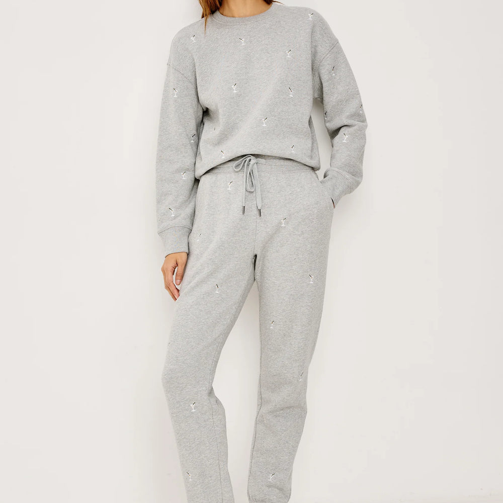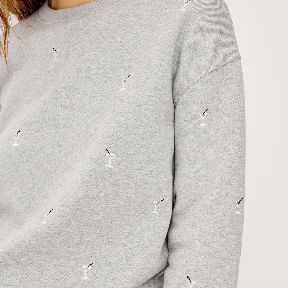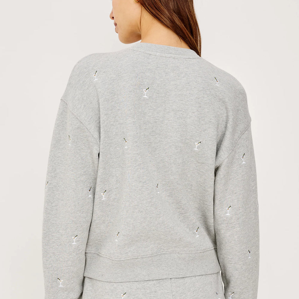 The Ramona blends comfort with cocktail-hour charm. Made from soft cotton fleece and embroidered with martinis, this playful staple features dropped shoulders, relaxed long sleeves, and tall ribbed trim at the neckline, cuffs, and hem.