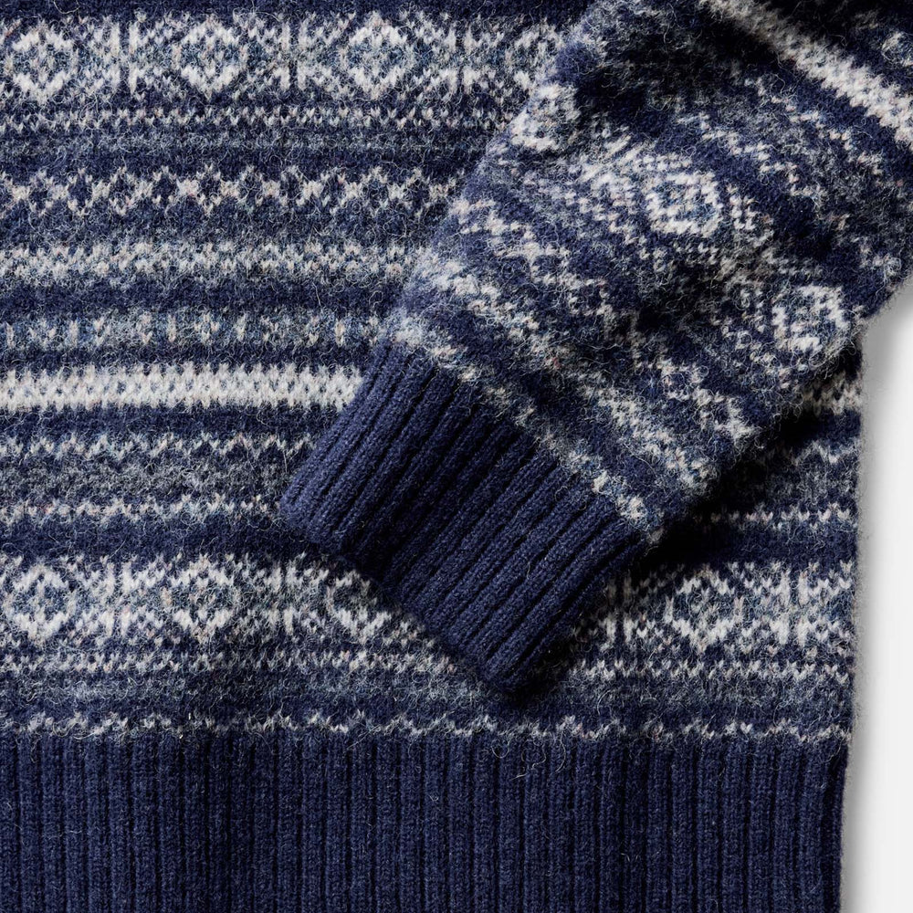 Knit from 100% RWS-certified wool for natural warmth, structure, and responsible sourcing. Crafted in a 5-gauge jersey knit that showcases the intricate Fair Isle pattern while maintaining a comfortable, easy drape. Finished with ribbed cuffs, hem, and collar for lasting shape and a polished look.