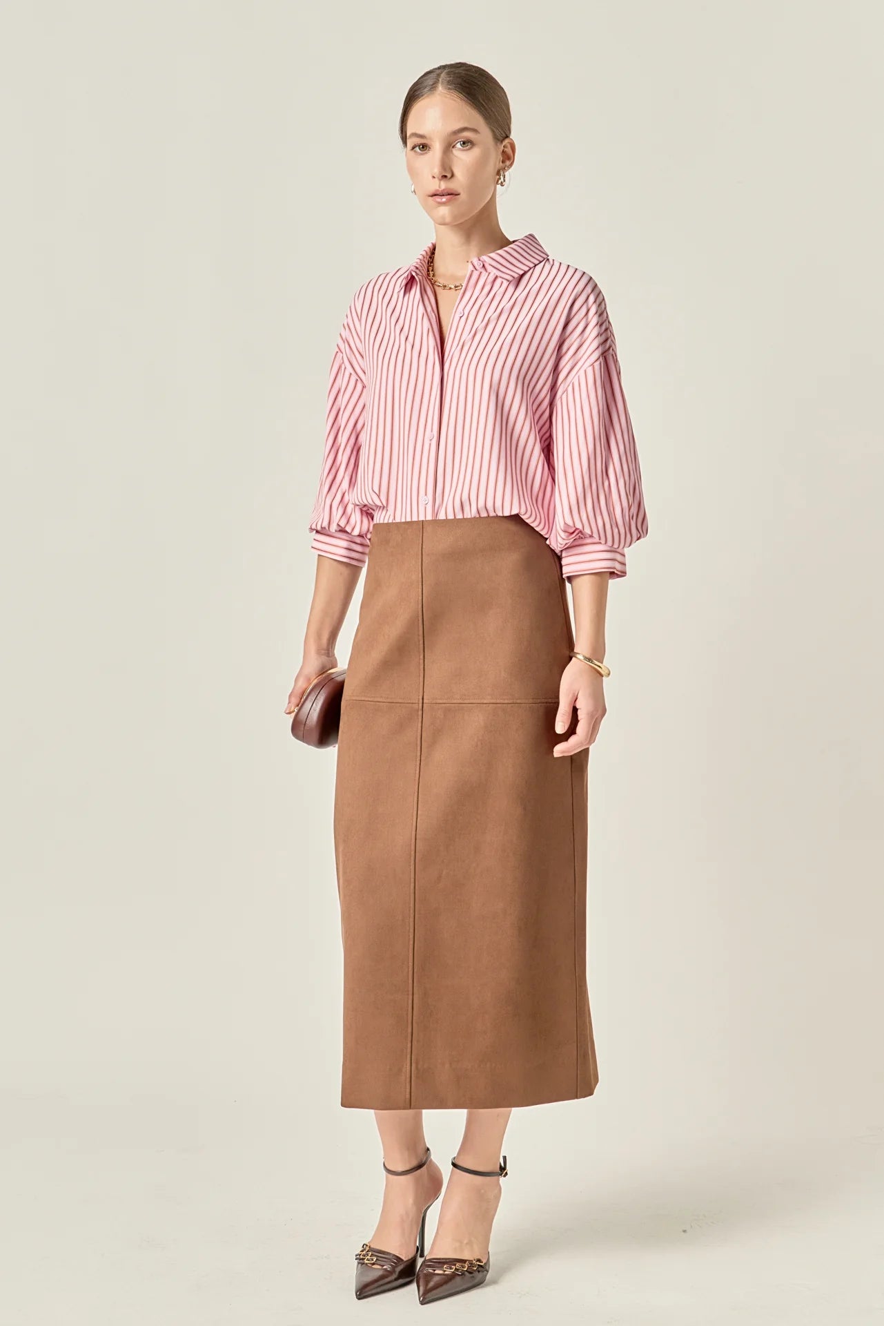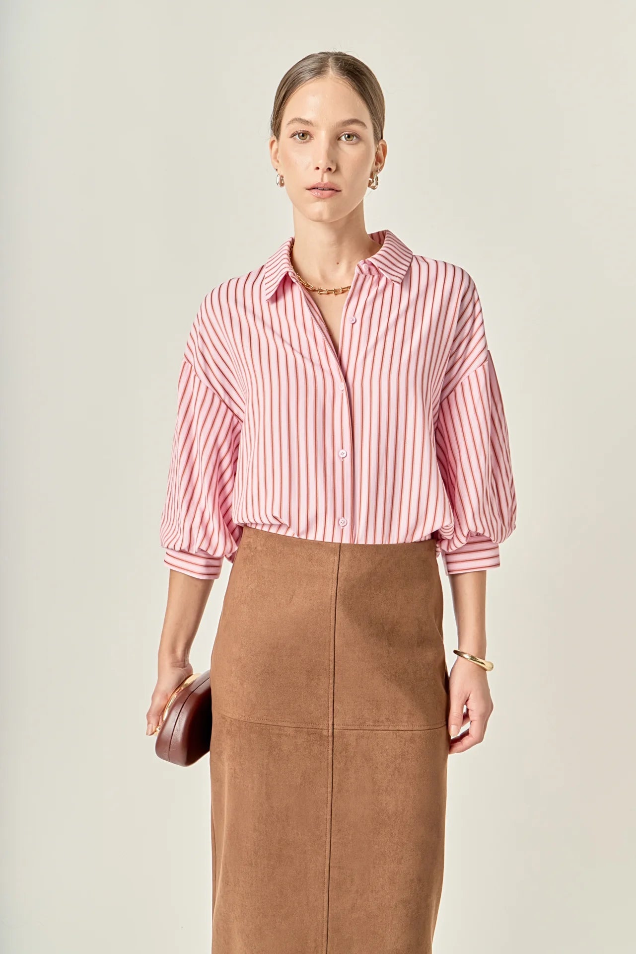This Striped Balloon Sleeve Shirt offers an easy, polished look with its lightweight feel and relaxed silhouette. Designed with soft pink and red stripes and finished with subtle balloon sleeves, it brings a fresh update to a classic button-down. The versatile shape makes it effortless to style for work, weekends, or anything in between, giving you a piece that feels comfortable while still looking refined.