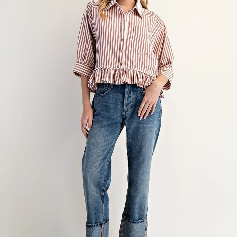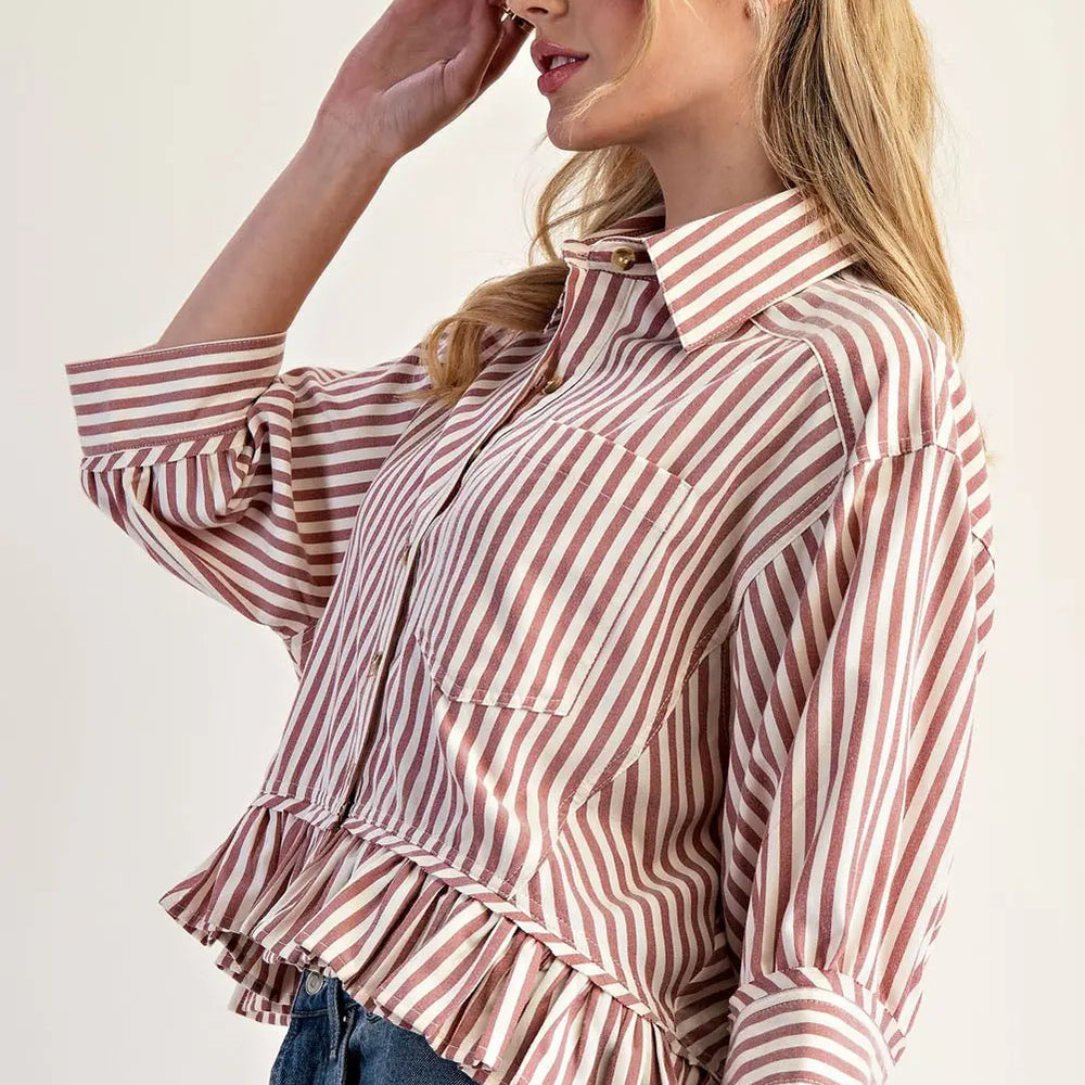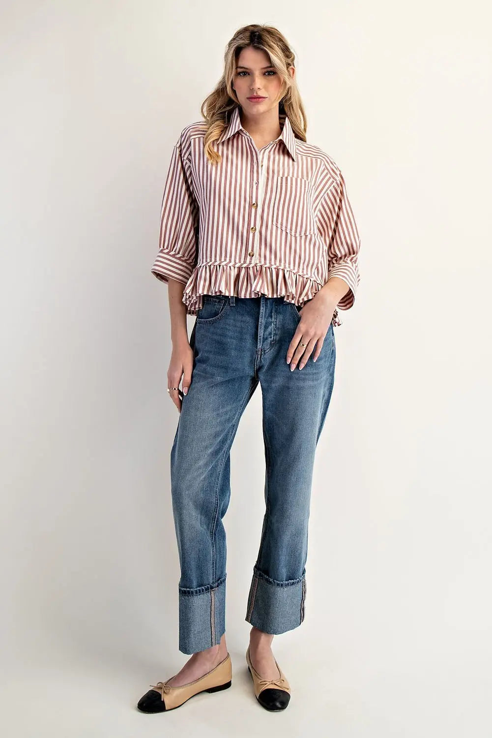 Product Detail: This striped top features a collared neckline, button up front, drop shoulders with buttoned cuff sleeves, a single chest pocket, and a ruffled hem for a playful twist on a classic silhouette.