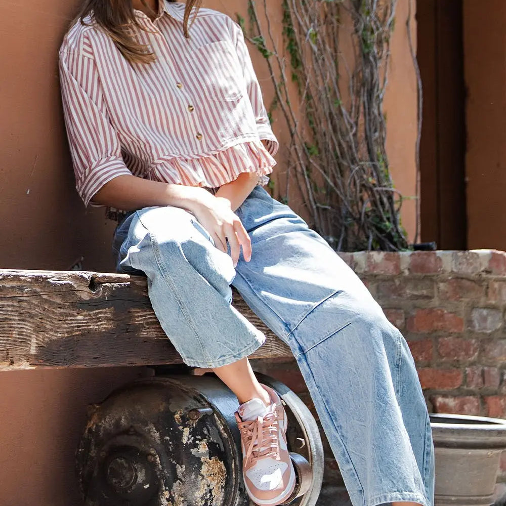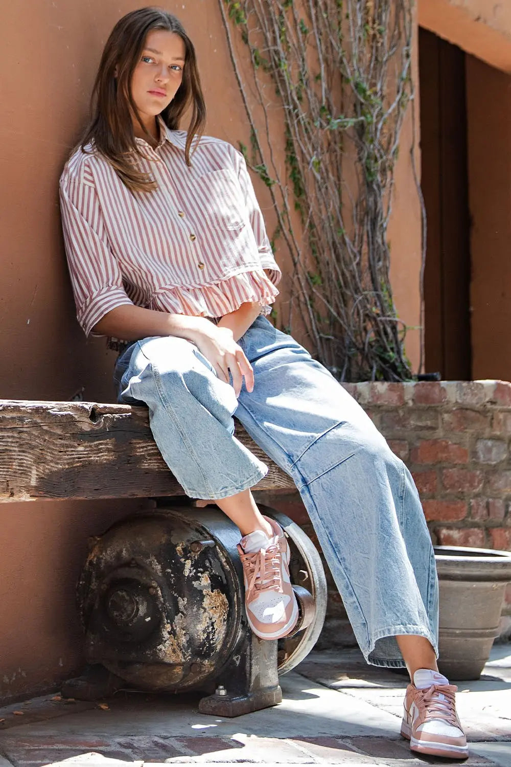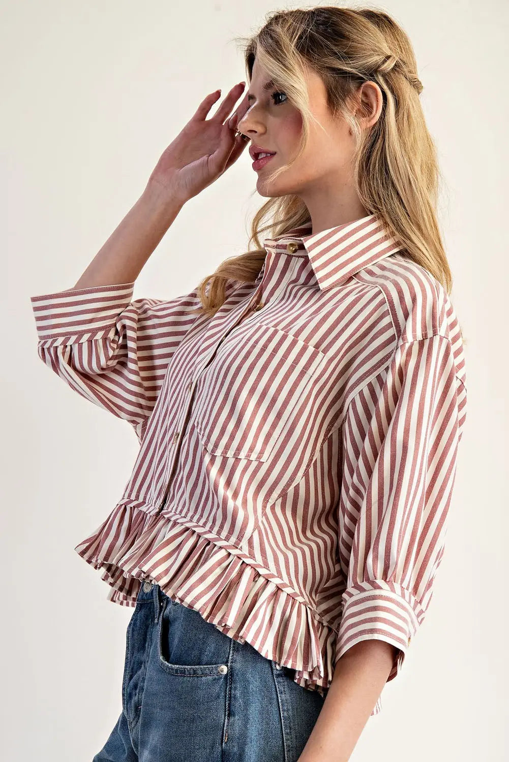 Product Detail: This striped top features a collared neckline, button up front, drop shoulders with buttoned cuff sleeves, a single chest pocket, and a ruffled hem for a playful twist on a classic silhouette.