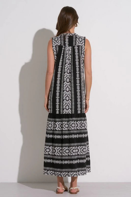Embrace effortless elegance with the Cyprus Maxi Dress. Featuring a tiered, flowy bottom and crafted from 100% cotton, this sleeveless beauty keeps you cool and stylish on warmer days. The eye-catching pattern adds a pop of charm, making it perfect for any sunny occasion.