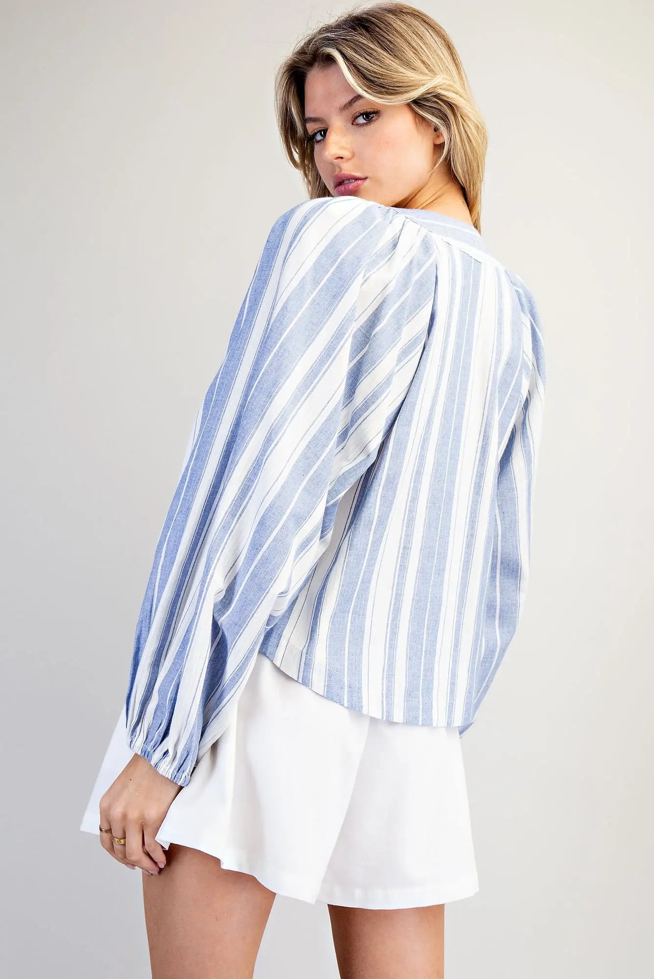 This striped top showcases a lace up V-neckline with metal grommet detailing, voluminous long sleeves with elastic cuffs, and a relaxed, slightly cropped silhouette for a breezy, nautical inspired look.