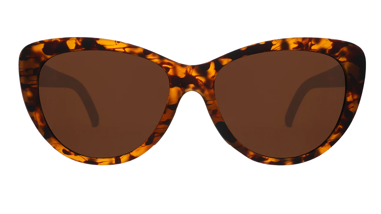 ME-OW!!! Take a walk on the wild side in these ferociously fashionable brown tortoiseshell sunglasses with brown non-reflective lenses and gold accents. WARNING: Wearing may result in an uptick of runway catfights due to extreme style envy.